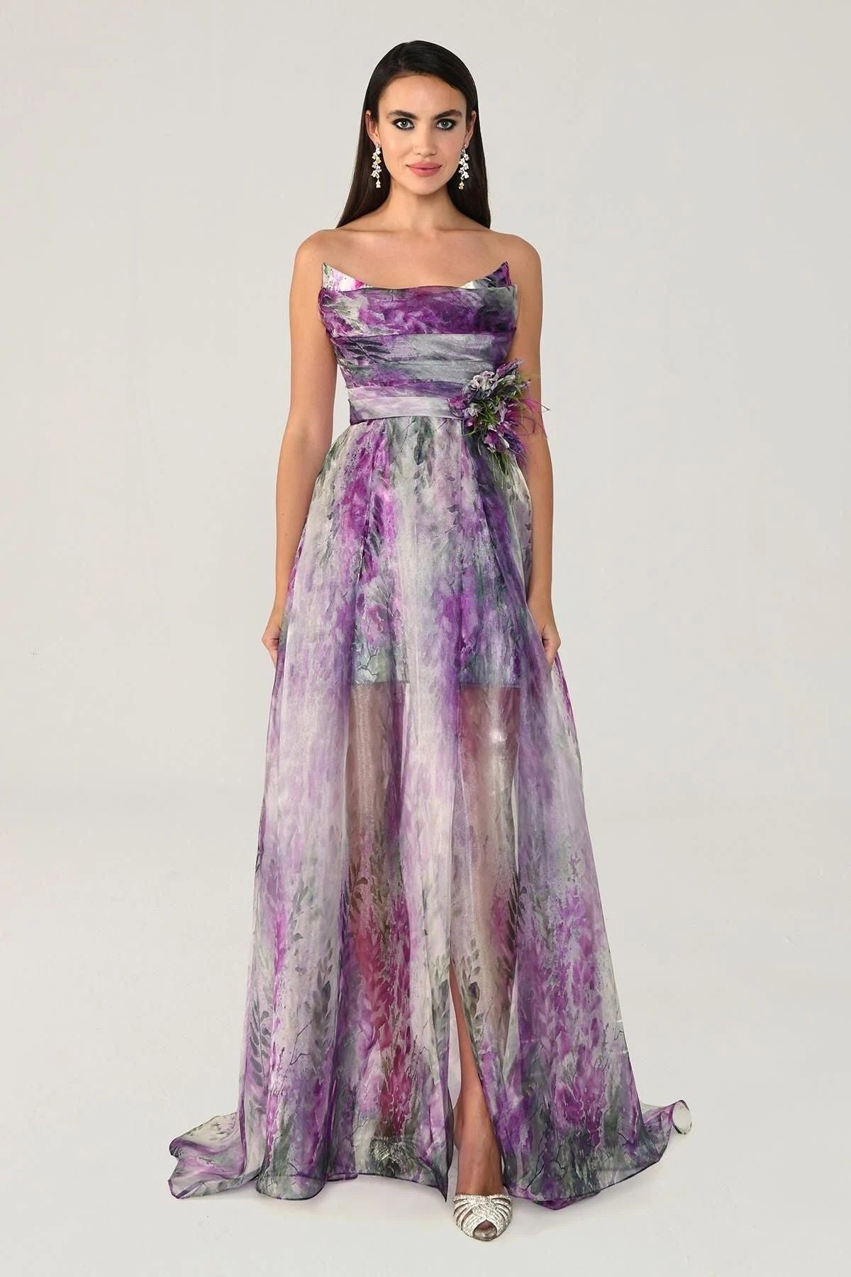Boat Neck Design: The dress features a boat neckline design that covers a wide portion of the shoulders and elegantly accentuates the neckline. Front Slit Detail: The dress features a slit at the front, extending downwards from the beginning of the skirt. This detail adds movement to the lower part of the dress while also providing elegance. Patterned Chiffon Fabric: The dress's main fabric is patterned chiffon. Chiffon is a lightweight, translucent material that generally provides an elegant flow. The patterns enhance the overall aesthetic of the dress. Maxi Size: The dress is maxi length, meaning it reaches down to the ankles. This style offers elegance and sophistication for special events or parties. Fabric Type: 100% Polyester; Model measurements: Height: 177 cm - Bust: 89 cm - Waist: 63 cm - Hips: 93 cm;