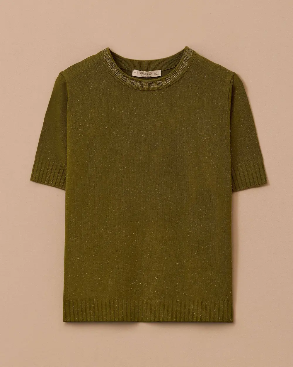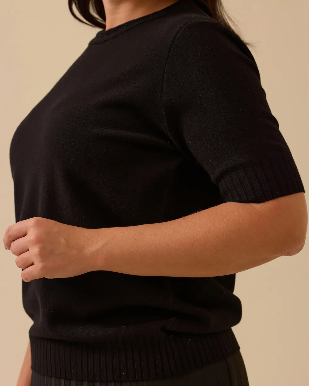 This plus-size, short-sleeved basic knit blouse, with its simple and timeless design, is a must-have piece in your wardrobe.