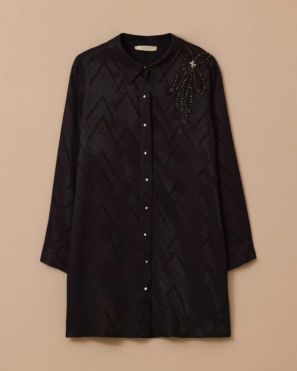 This plus-size beaded button-down tunic offers a stylish look with its elegant beading on the shoulders.