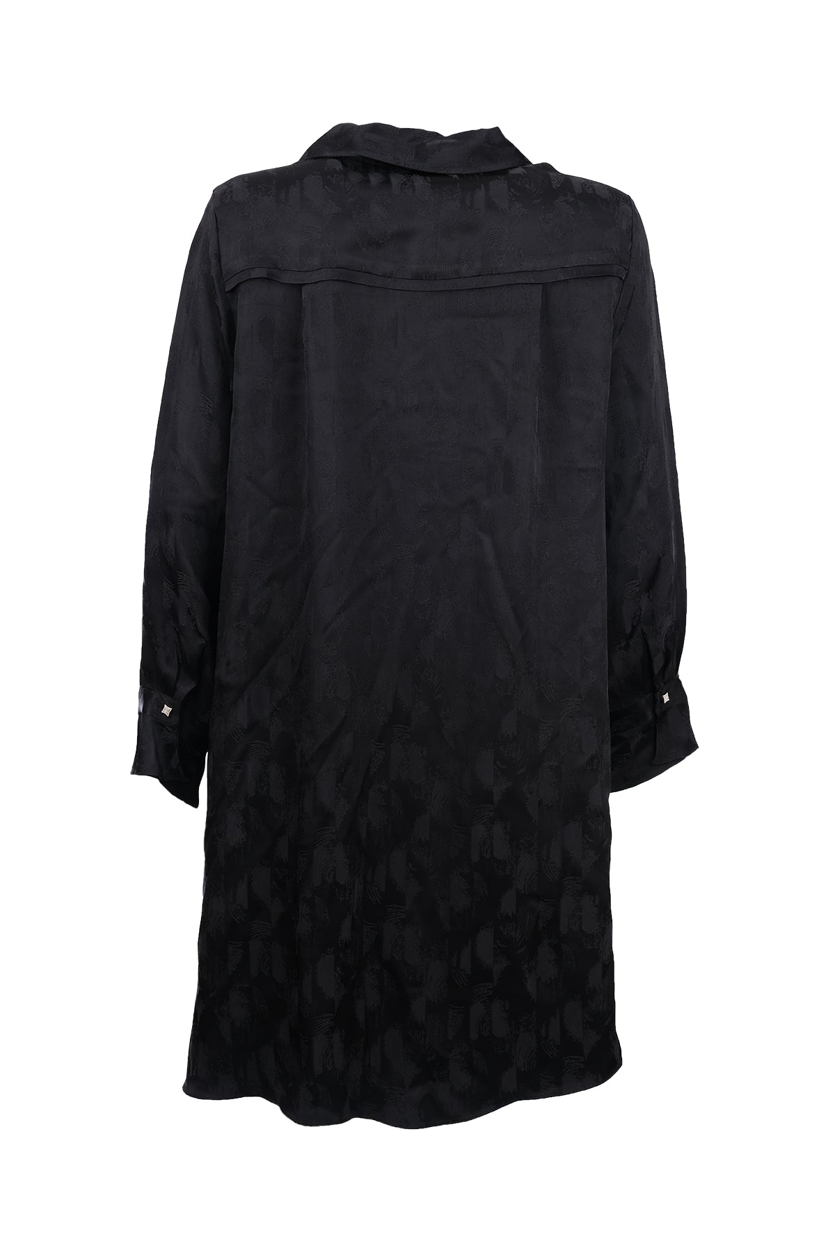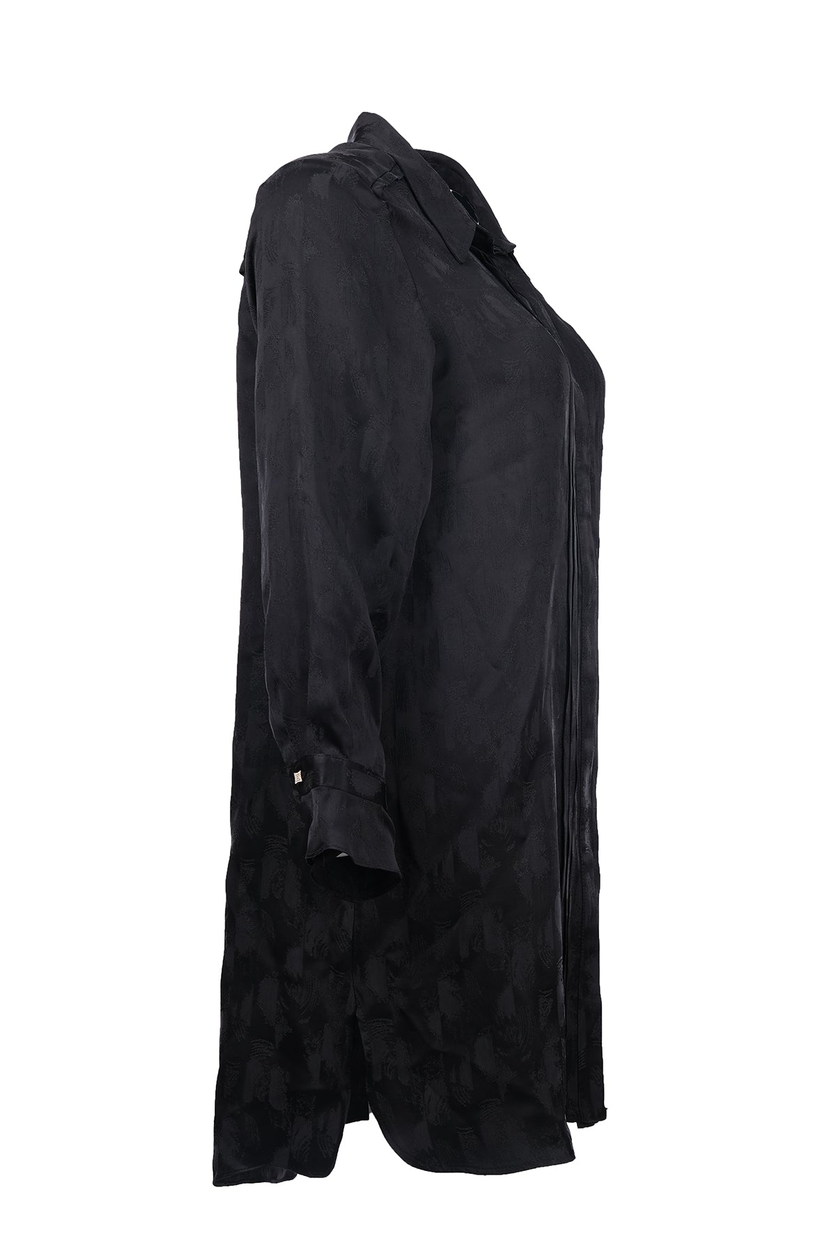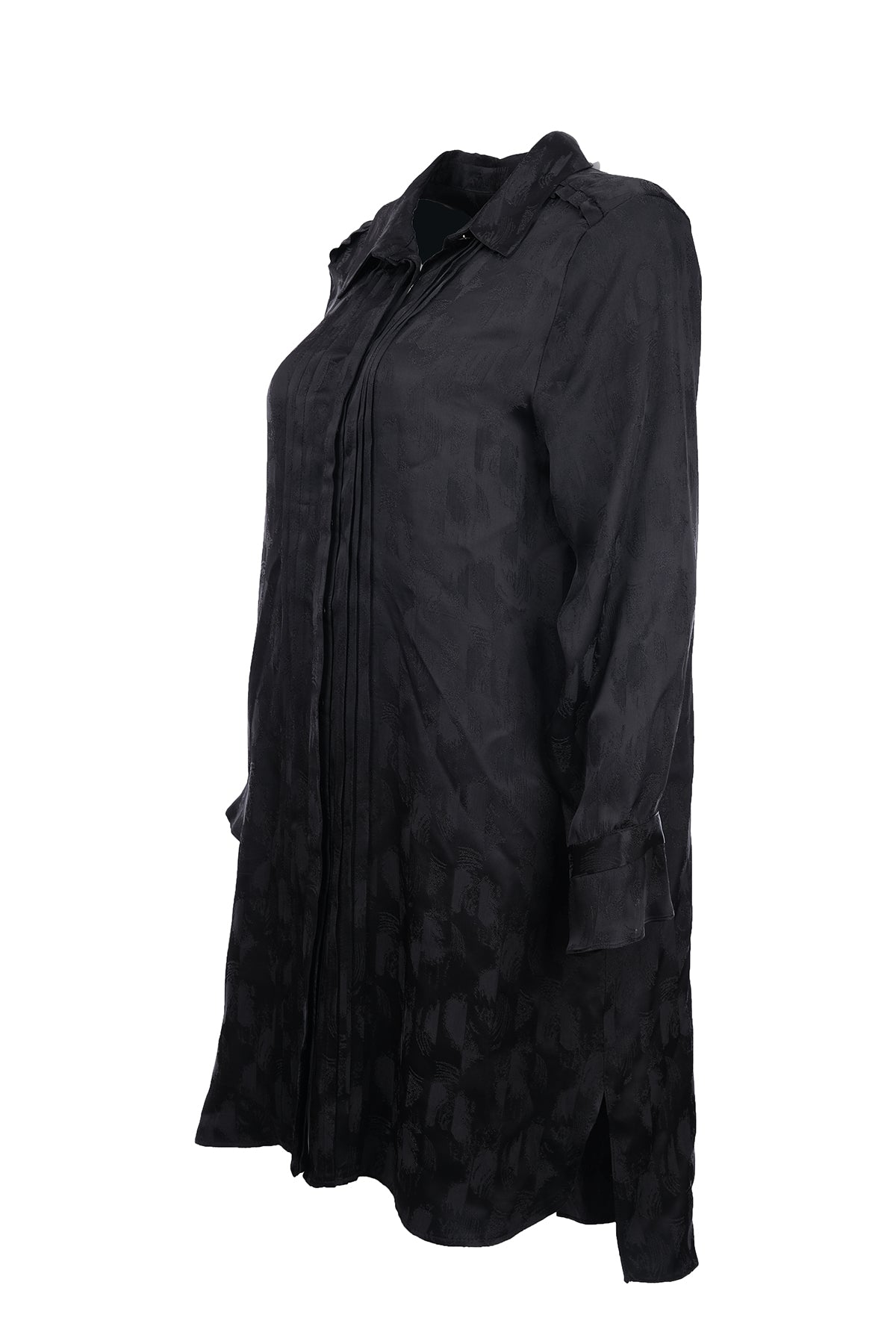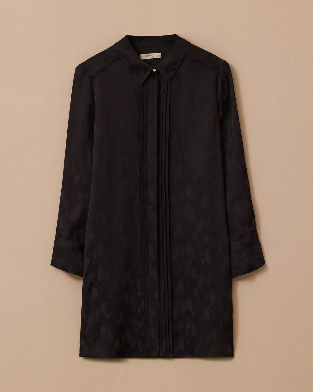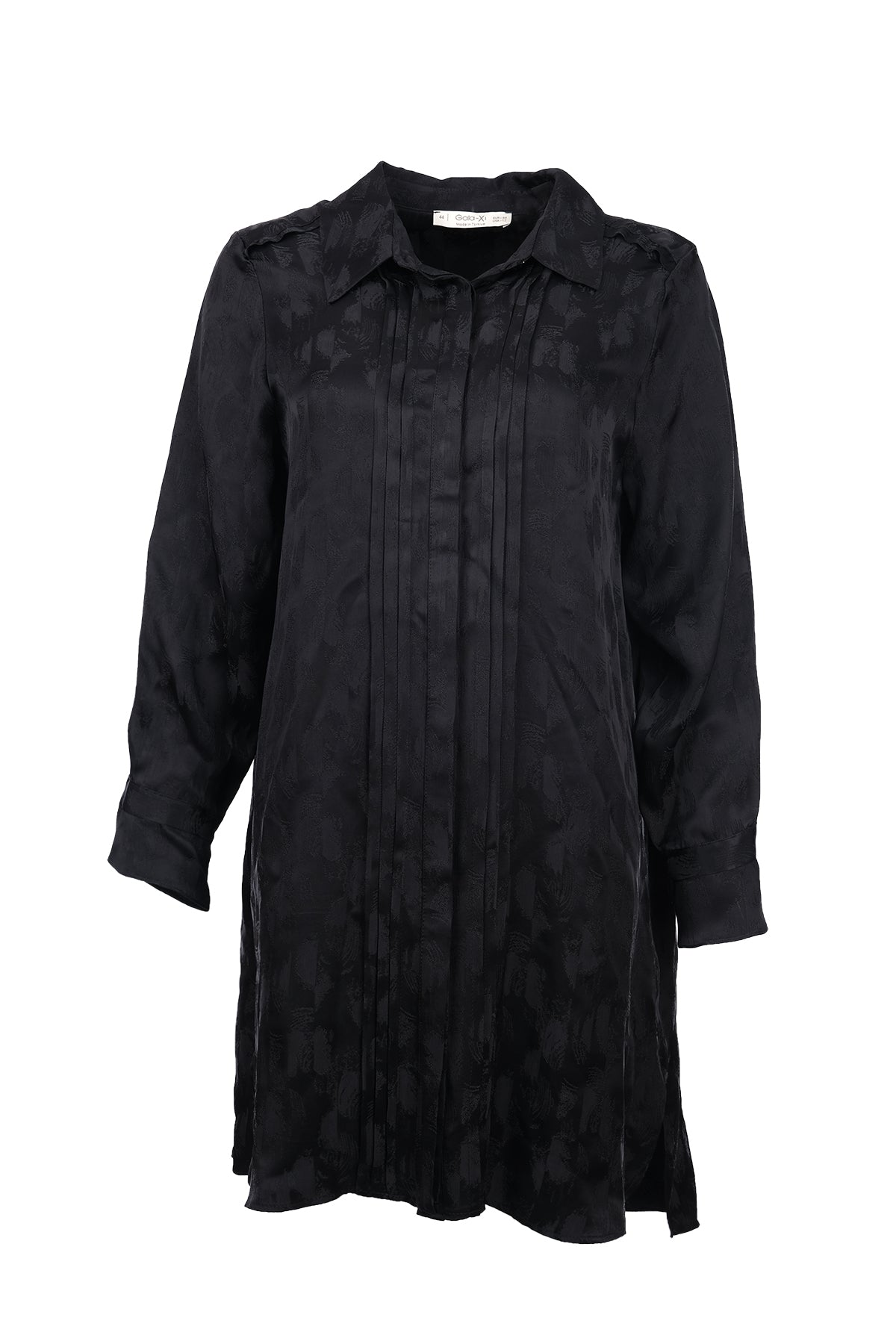 This plus-size patterned tunic with pleats offers elegance with its modern design and pleat details.