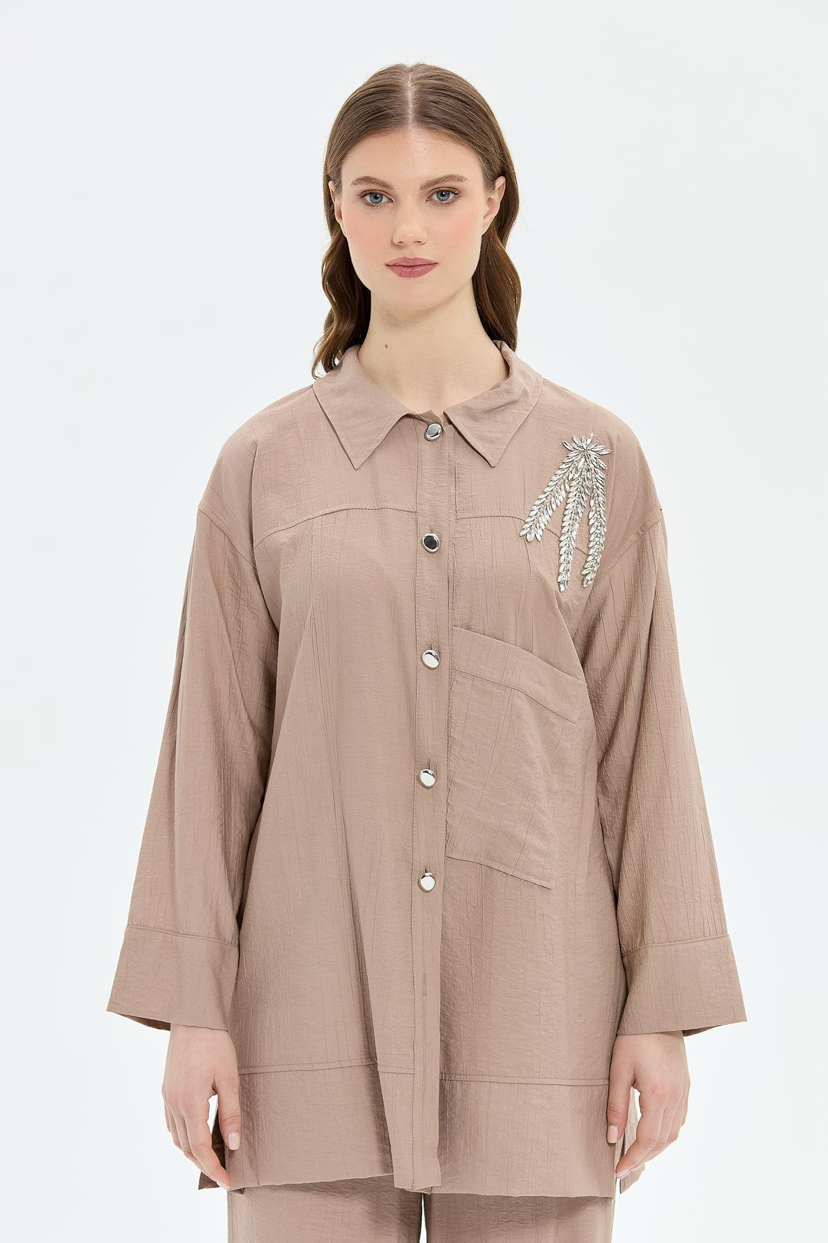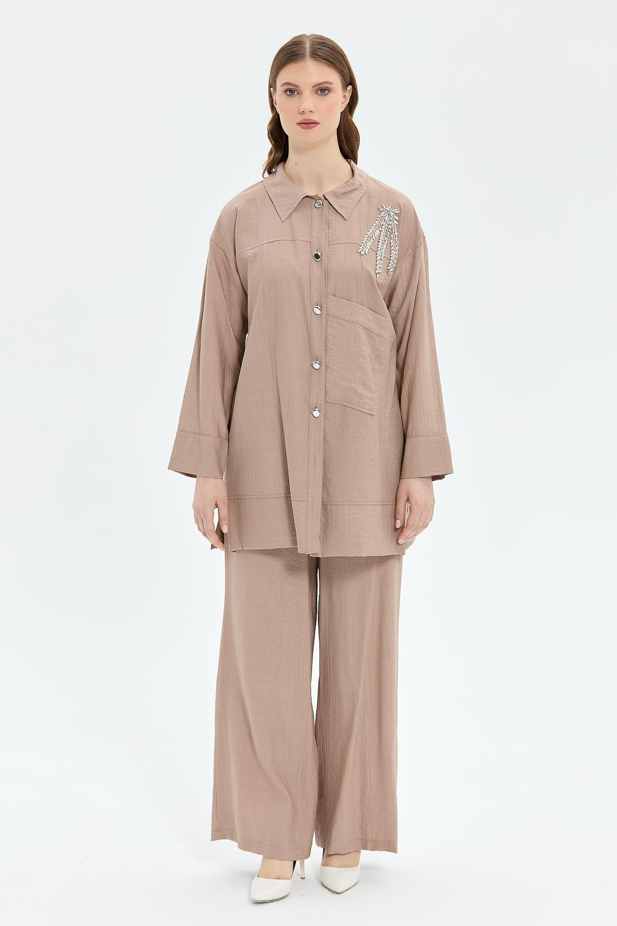 Woven fabric, button closure, embellished with rhinestones, elasticated waist trousers set, relaxed fit, shirt length 88 cm, trouser length 110 cm.