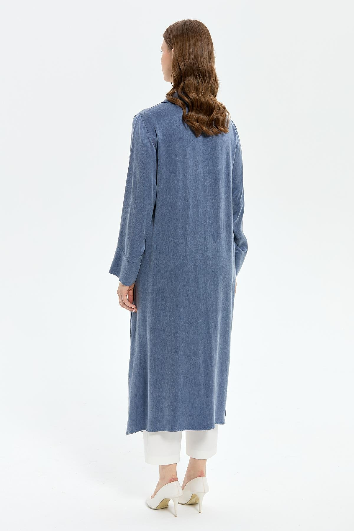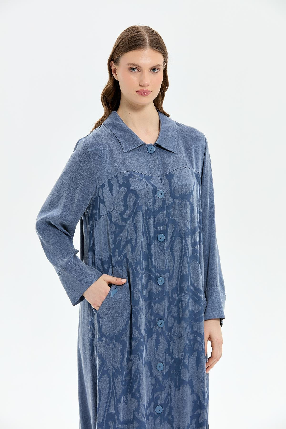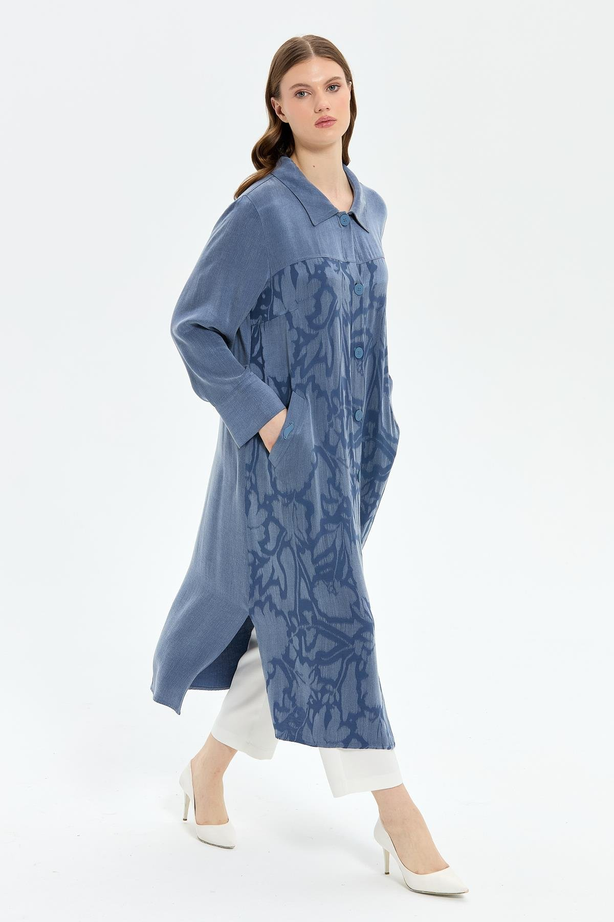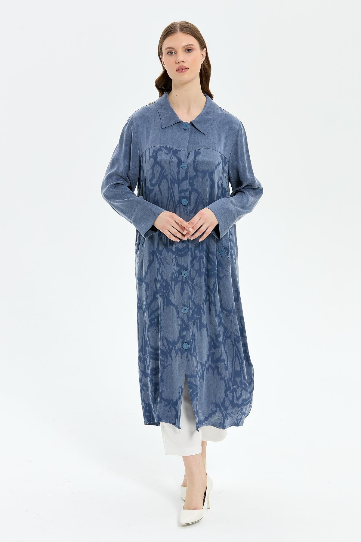 Woven silk cupro fabric. Button closure. Patterned and plain trimmed coat. True to size. Coat length 123 cm.