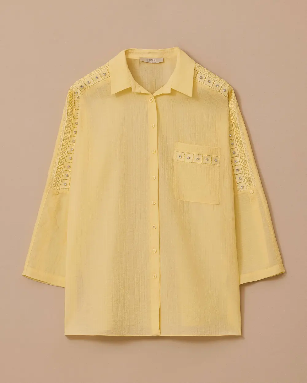 This plus-size textured shirt with stone embellishments stands out with its elegant details and comfortable fit.