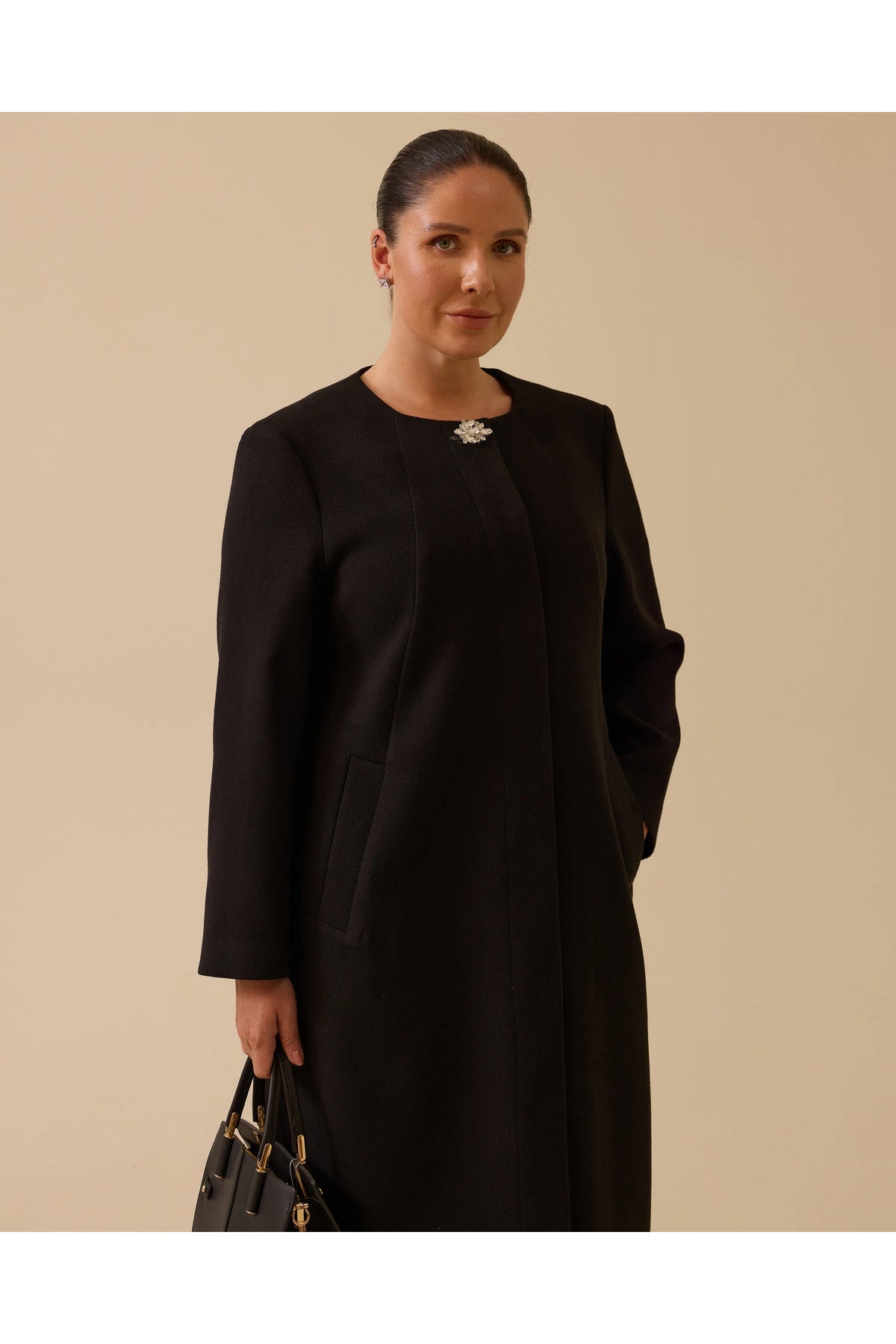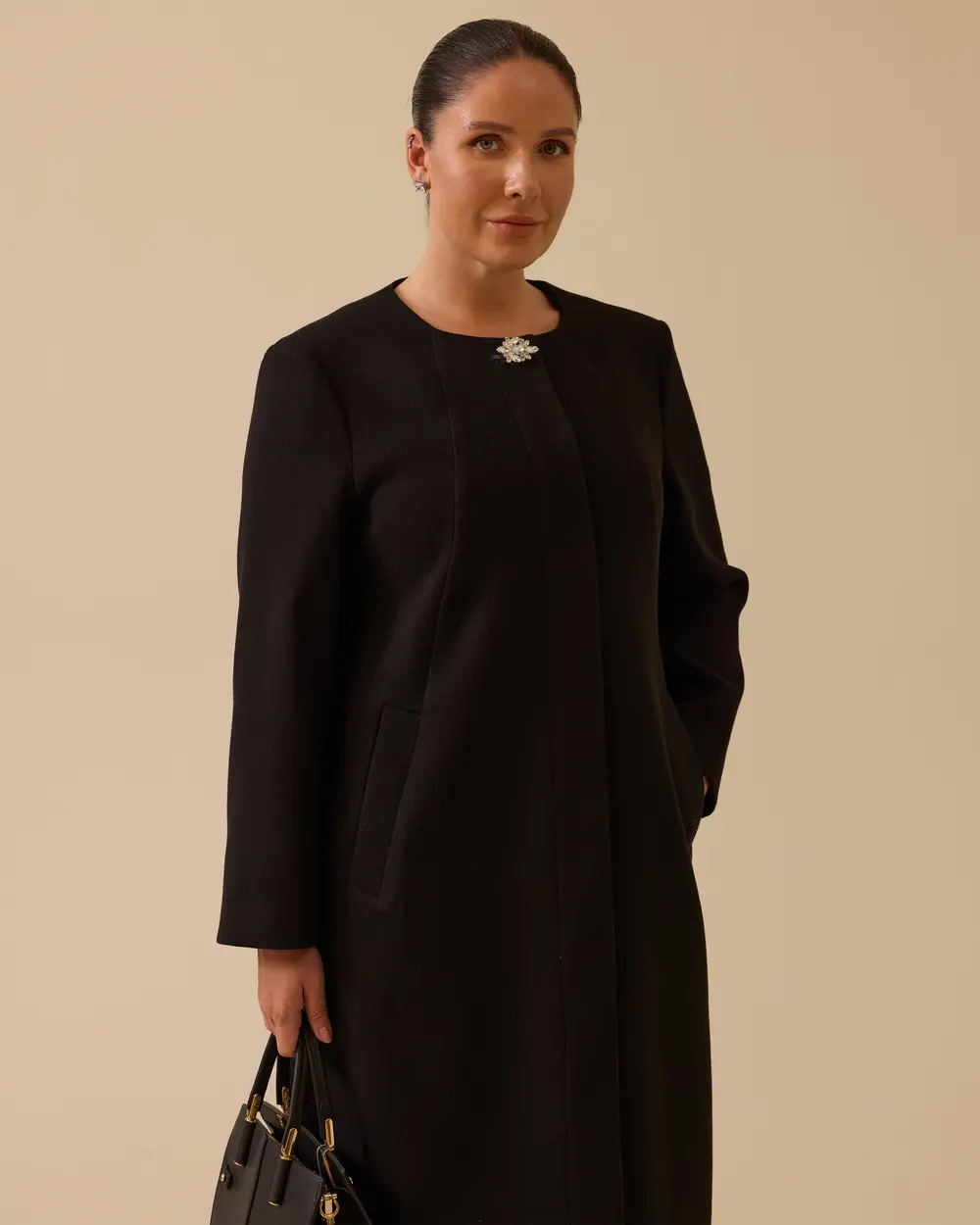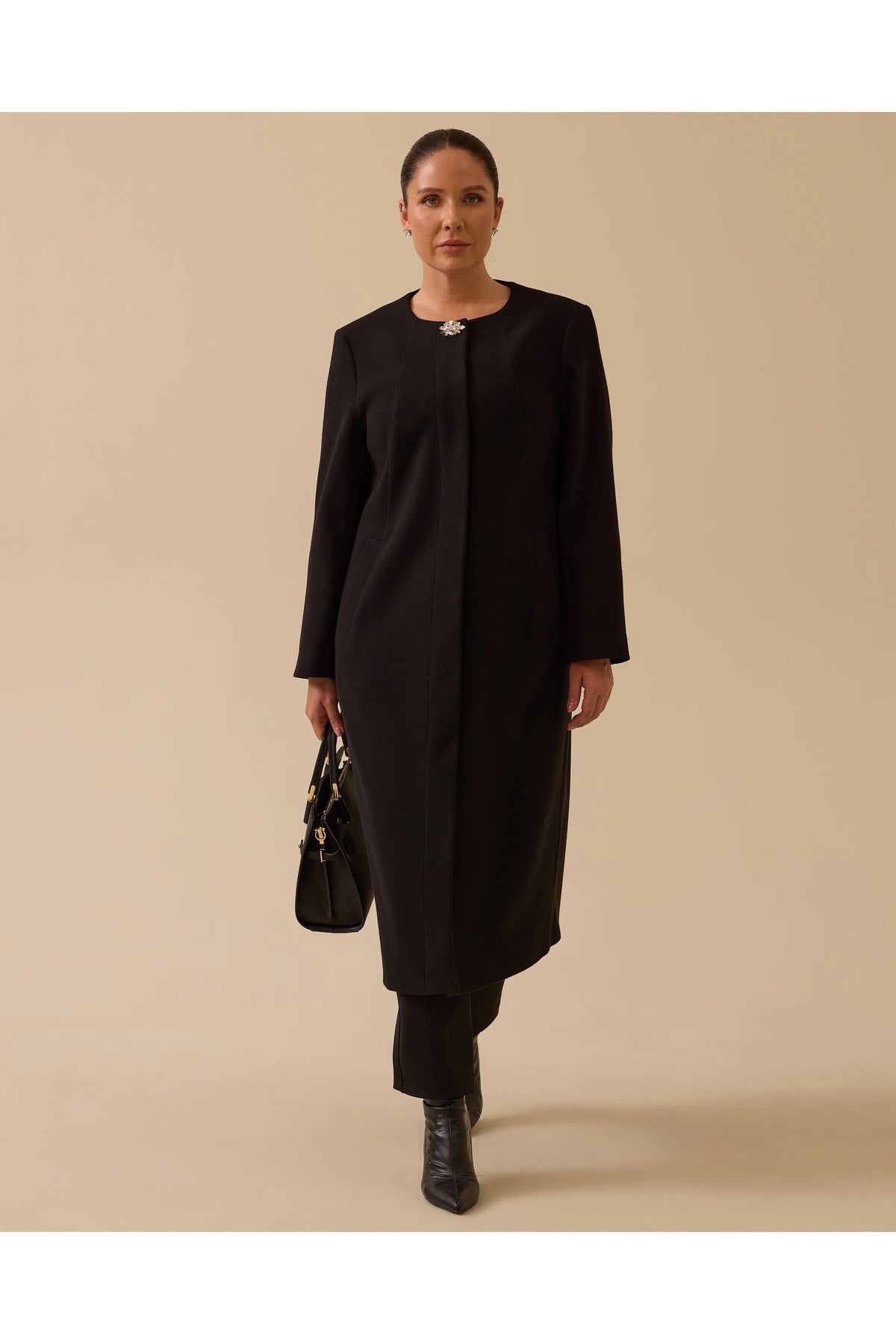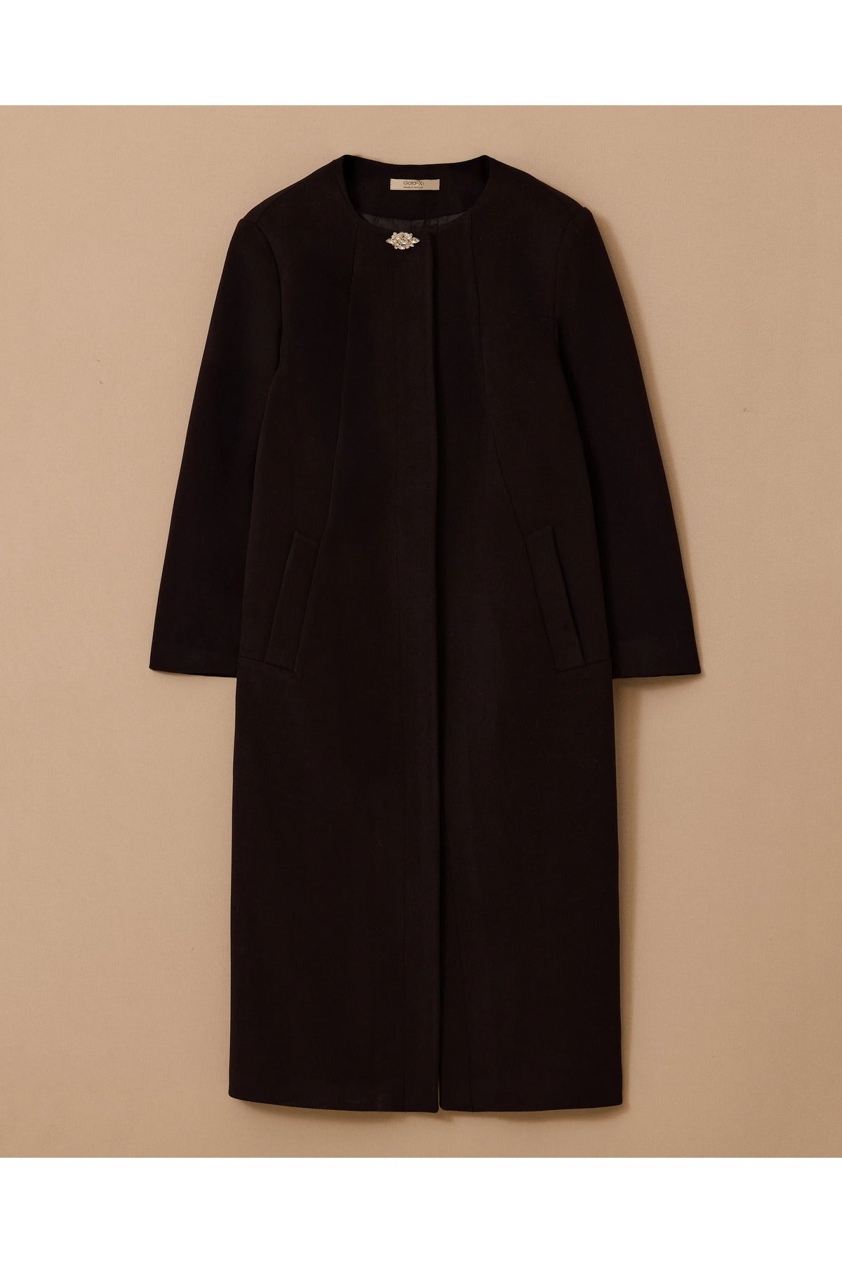 This plus-size , long cashmere coat with embellished details features delicate stones that add a touch of elegance.