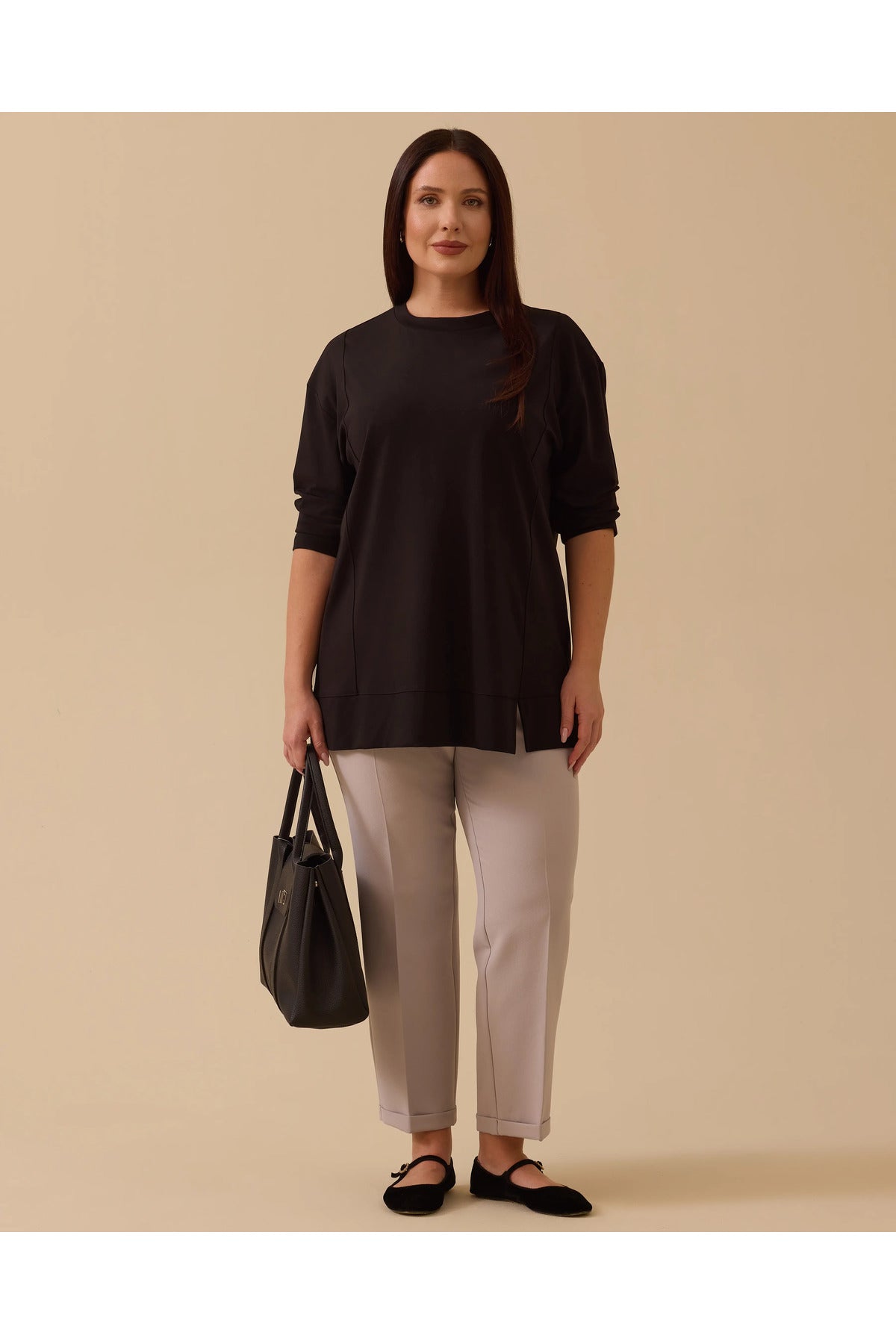 This plus-size, long-sleeved basic tunic offers everyday elegance with its simple design and comfortable fit .