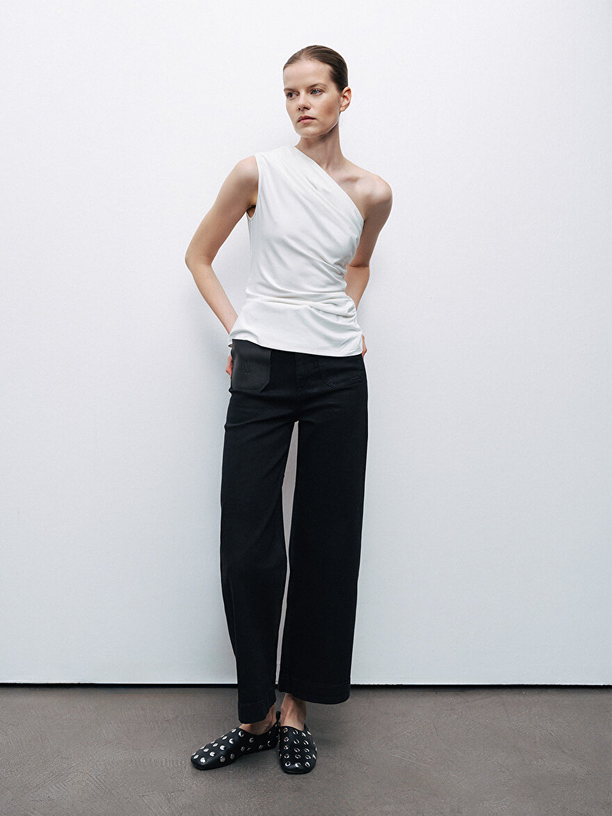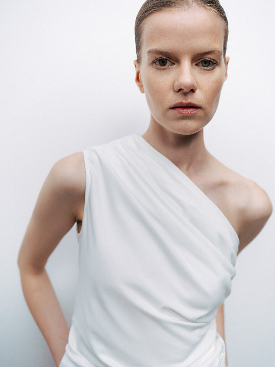 Product Description: Slim fit, regular cut, unlined, knitted, asymmetrical neckline, one-shoulder blouse with gathered detail.
