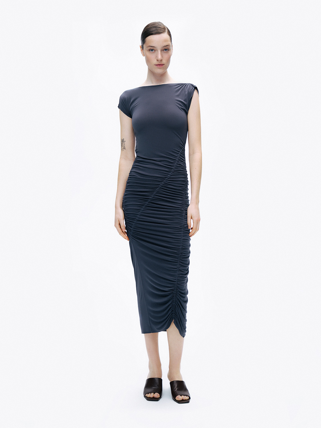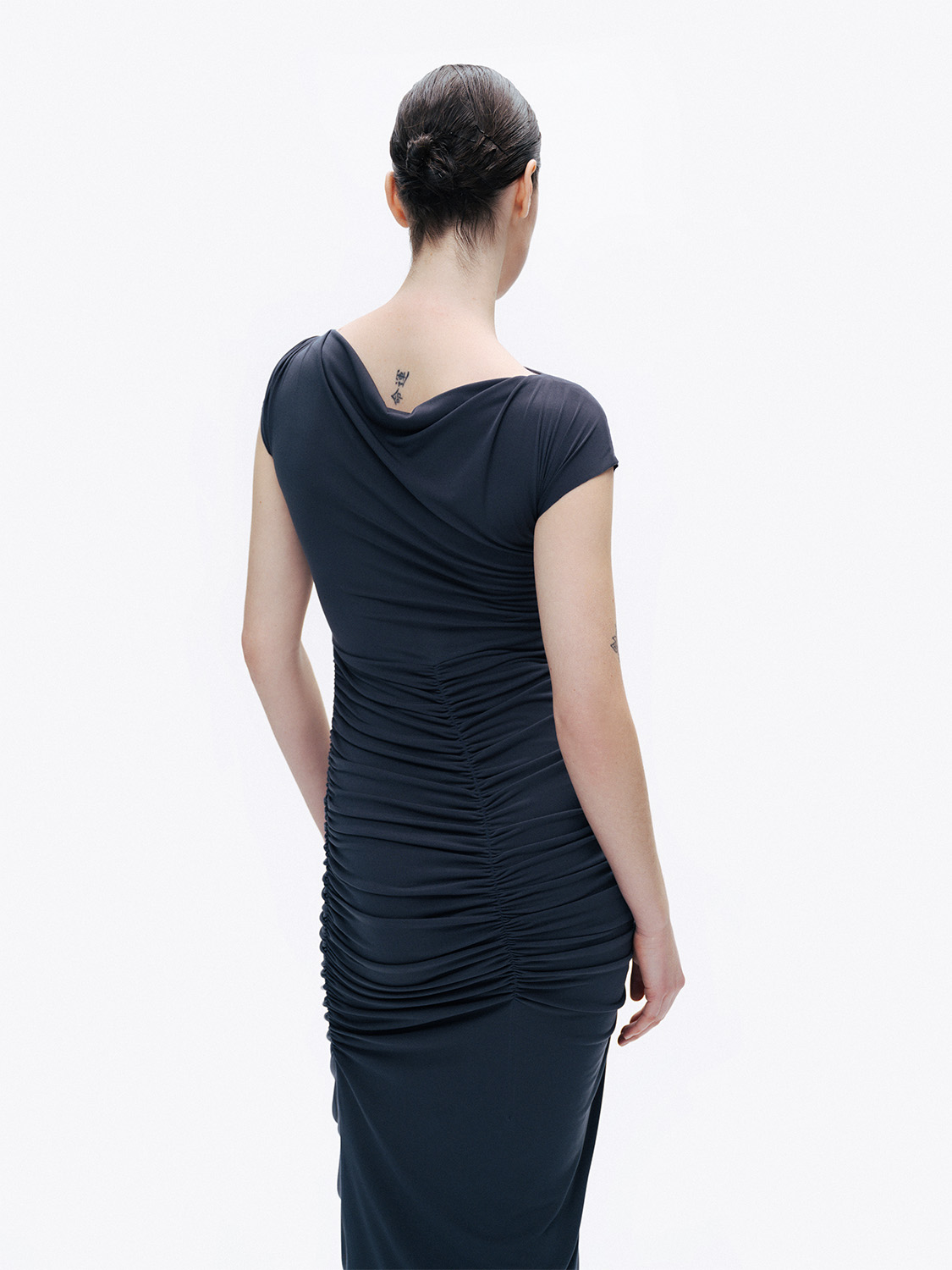 Product Description: Slim fit, regular cut, unlined, crew neck, maxi dress with drape and ruching details.
