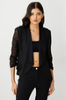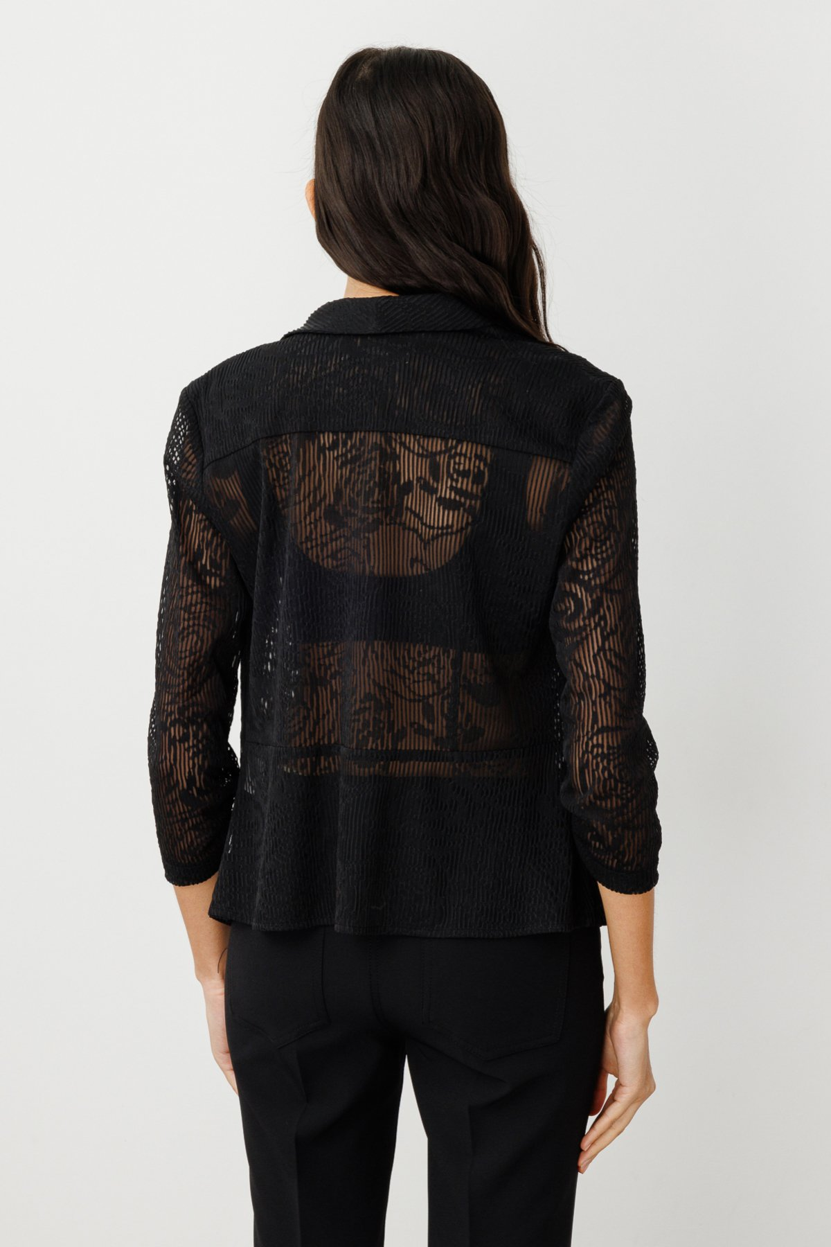 Product Features: Shawl collar, self-patterned, transparent, gathered sleeves.