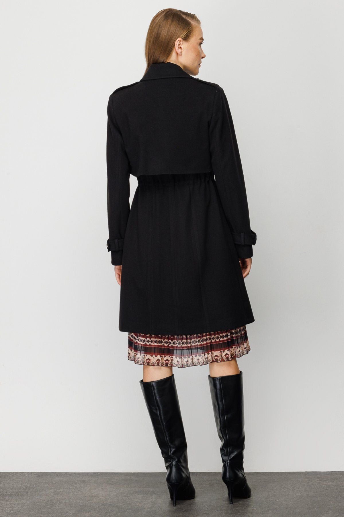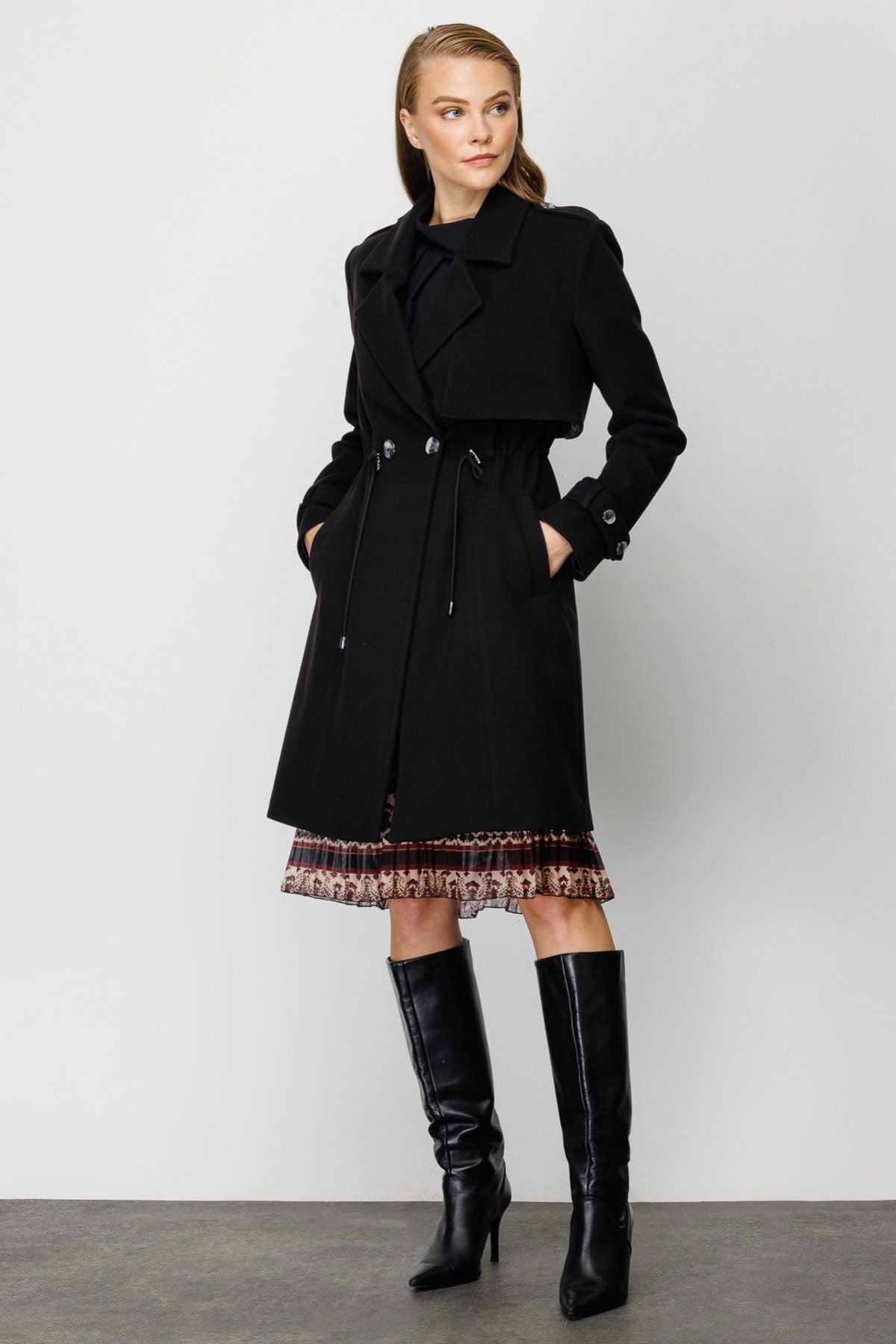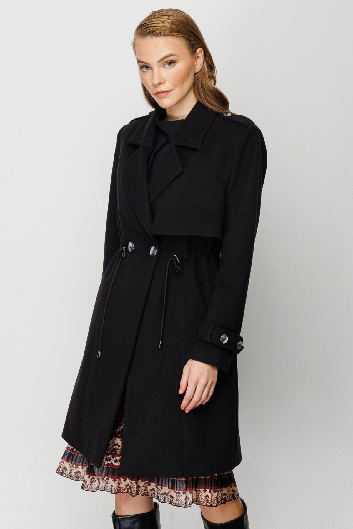 Product Features:; Epaulette; Cashmere fabric; Lined; Single button front; Waistband with stopper; Product Fit: Regular Fit; Product Thickness: Medium; Product Length: 94 cm; Fabric Composition: 82% polyester 15% rayon 3% spandex; Model Measurements:; Sample Size: Ekol: 38; Model Height: 176 cm; Model Measurements: 84/61/89;