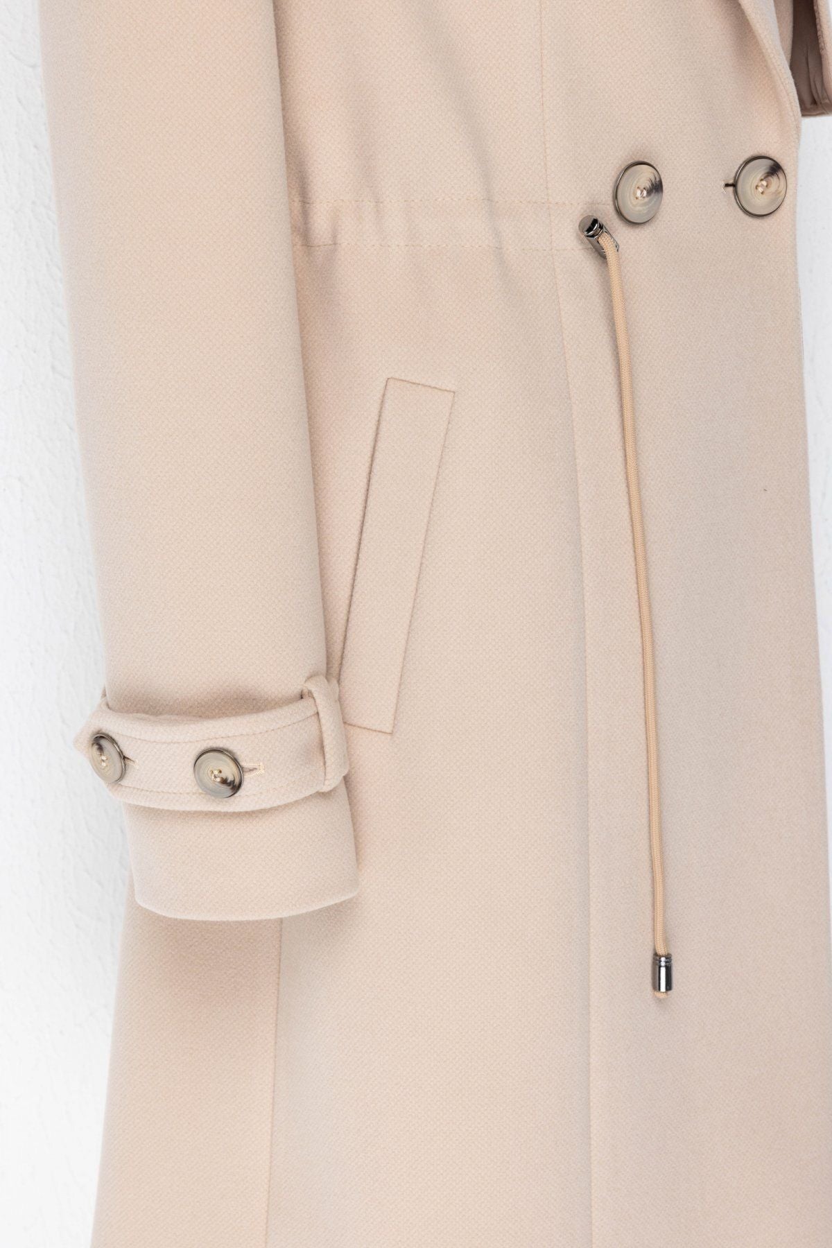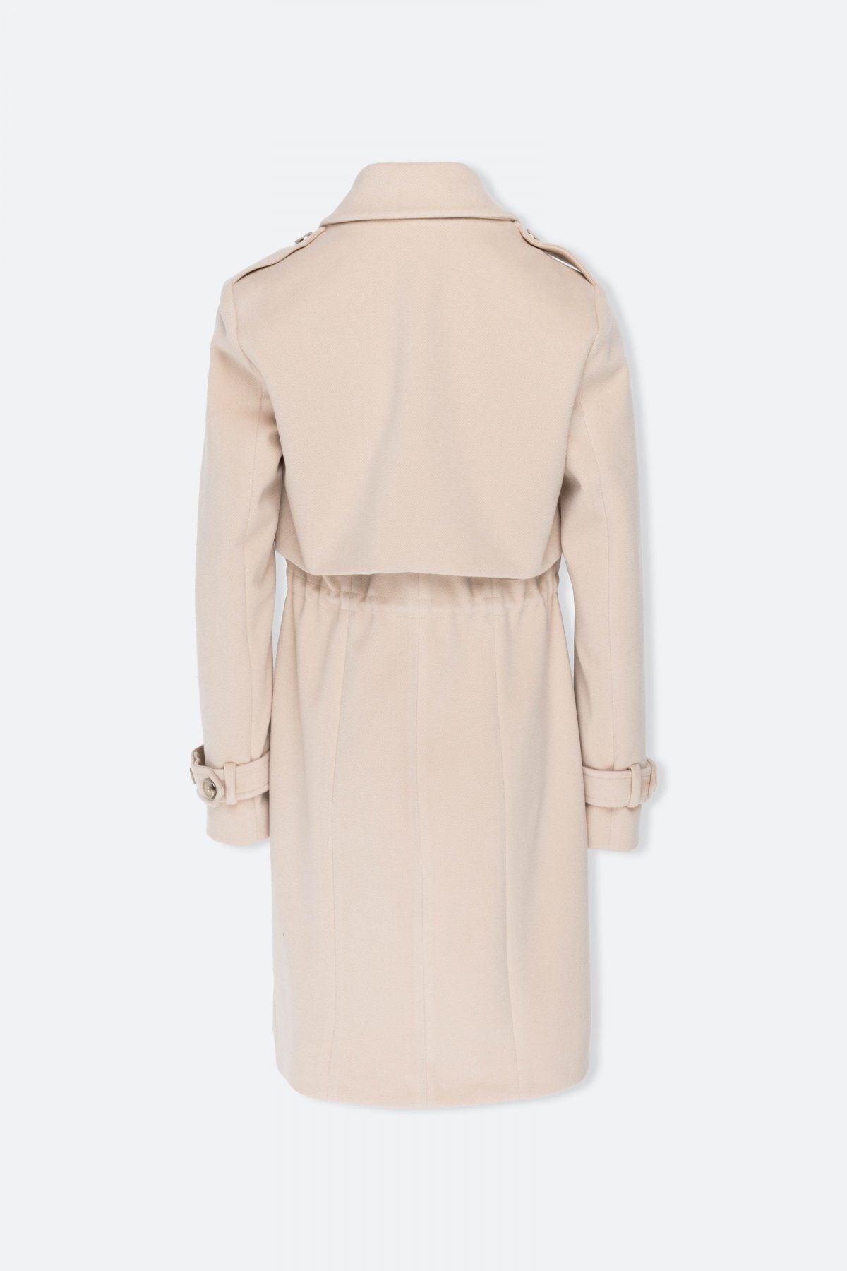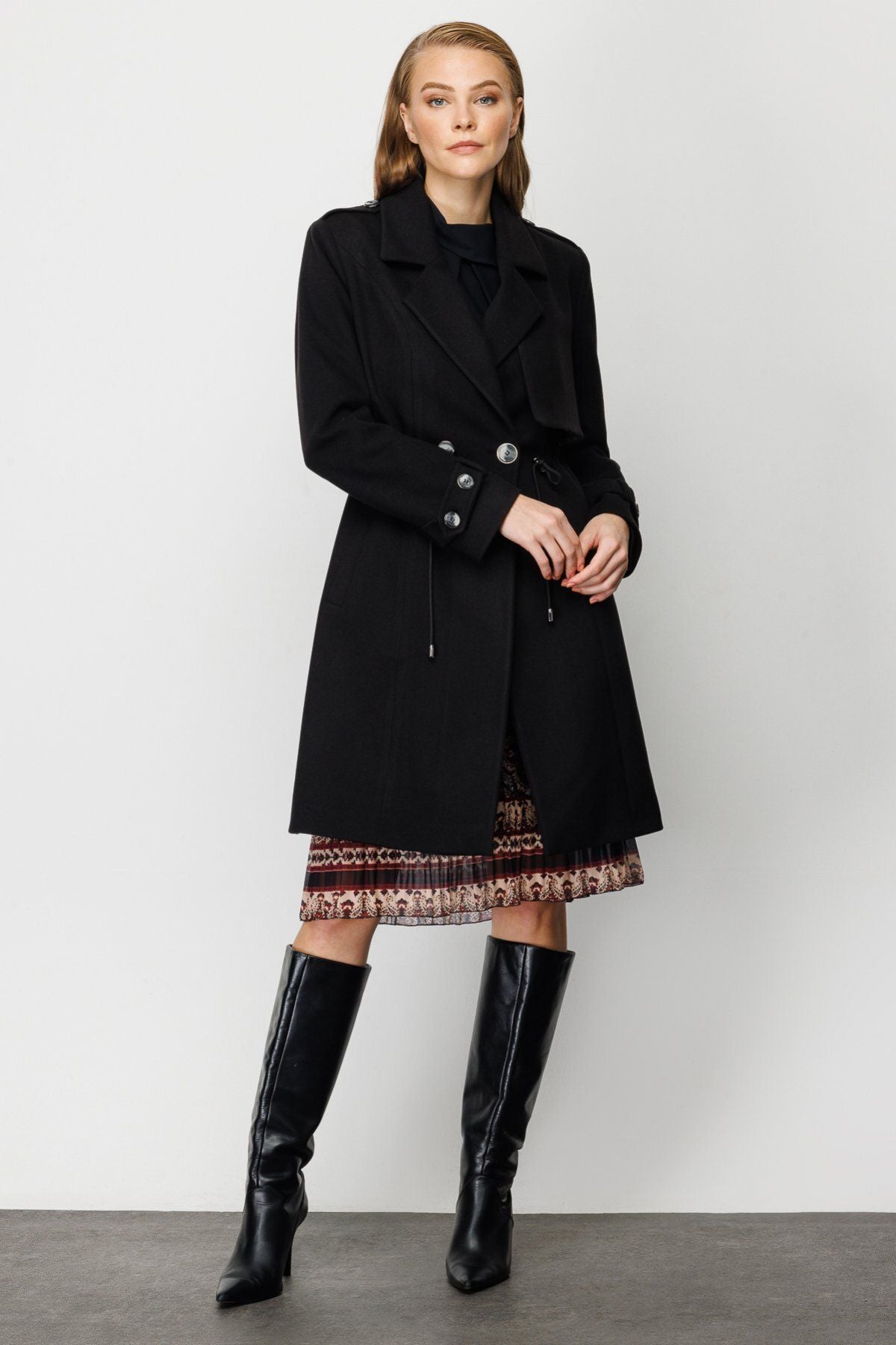 Product Features:; Epaulette; Cashmere fabric; Lined; Single button front; Waistband with stopper; Product Fit: Regular Fit; Product Thickness: Medium; Product Length: 94 cm; Fabric Composition: 82% polyester 15% rayon 3% spandex; Model Measurements:; Sample Size: Ekol: 38; Model Height: 176 cm; Model Measurements: 84/61/89;
