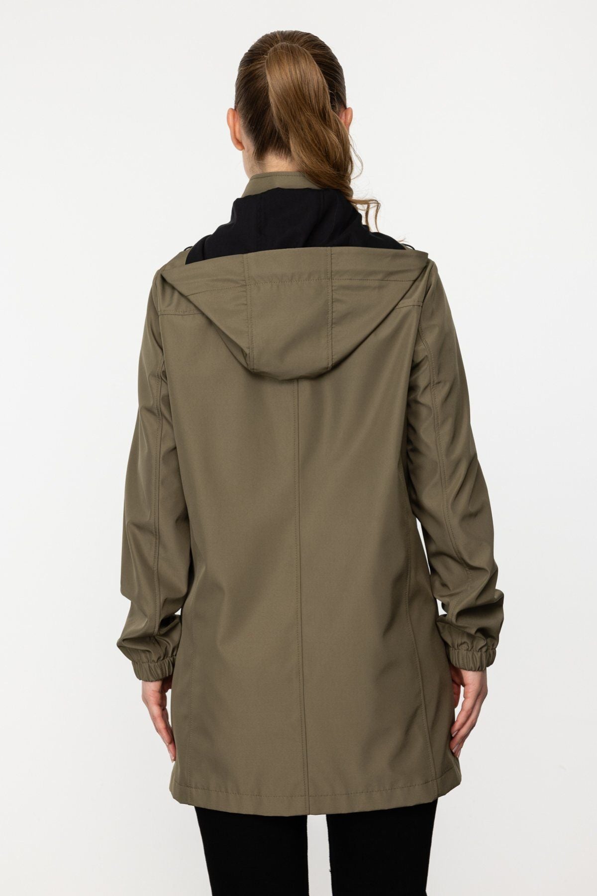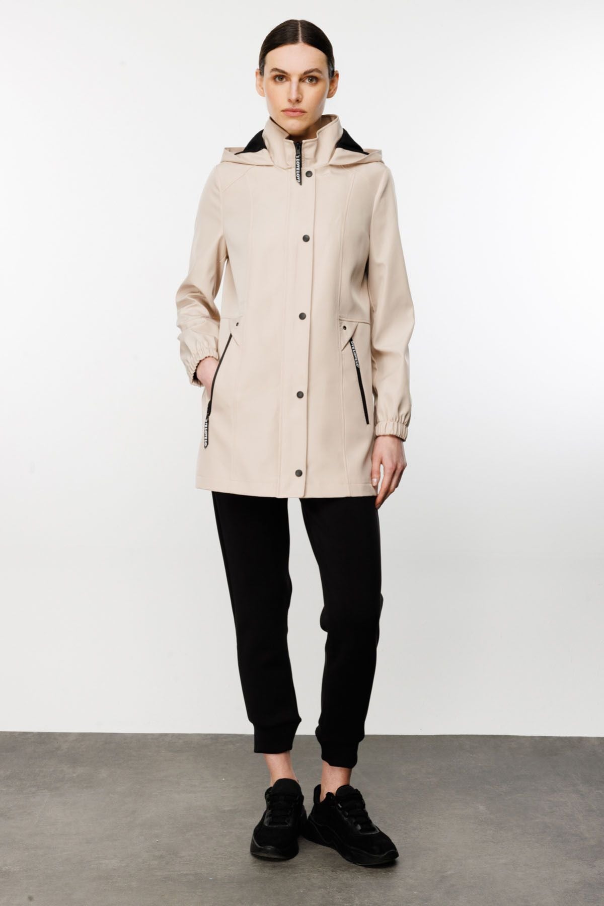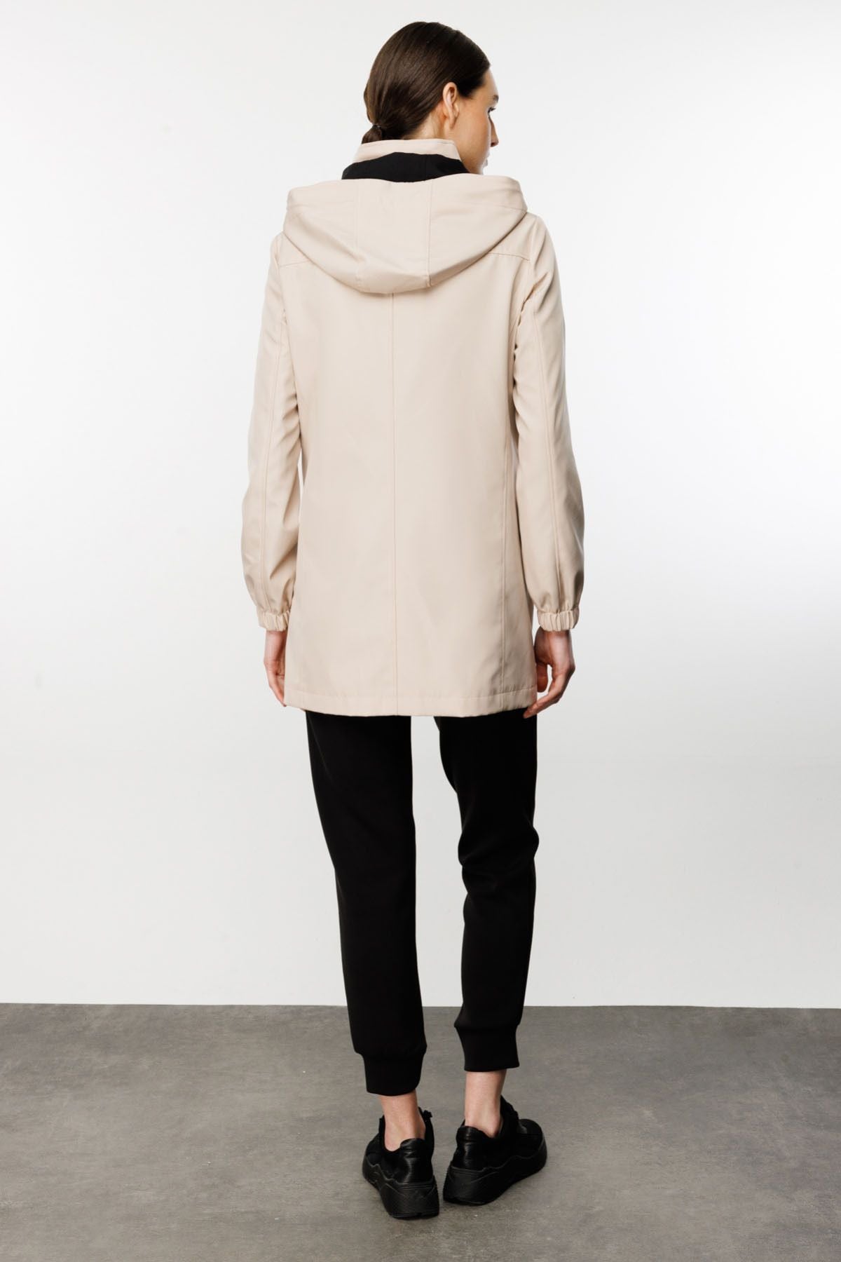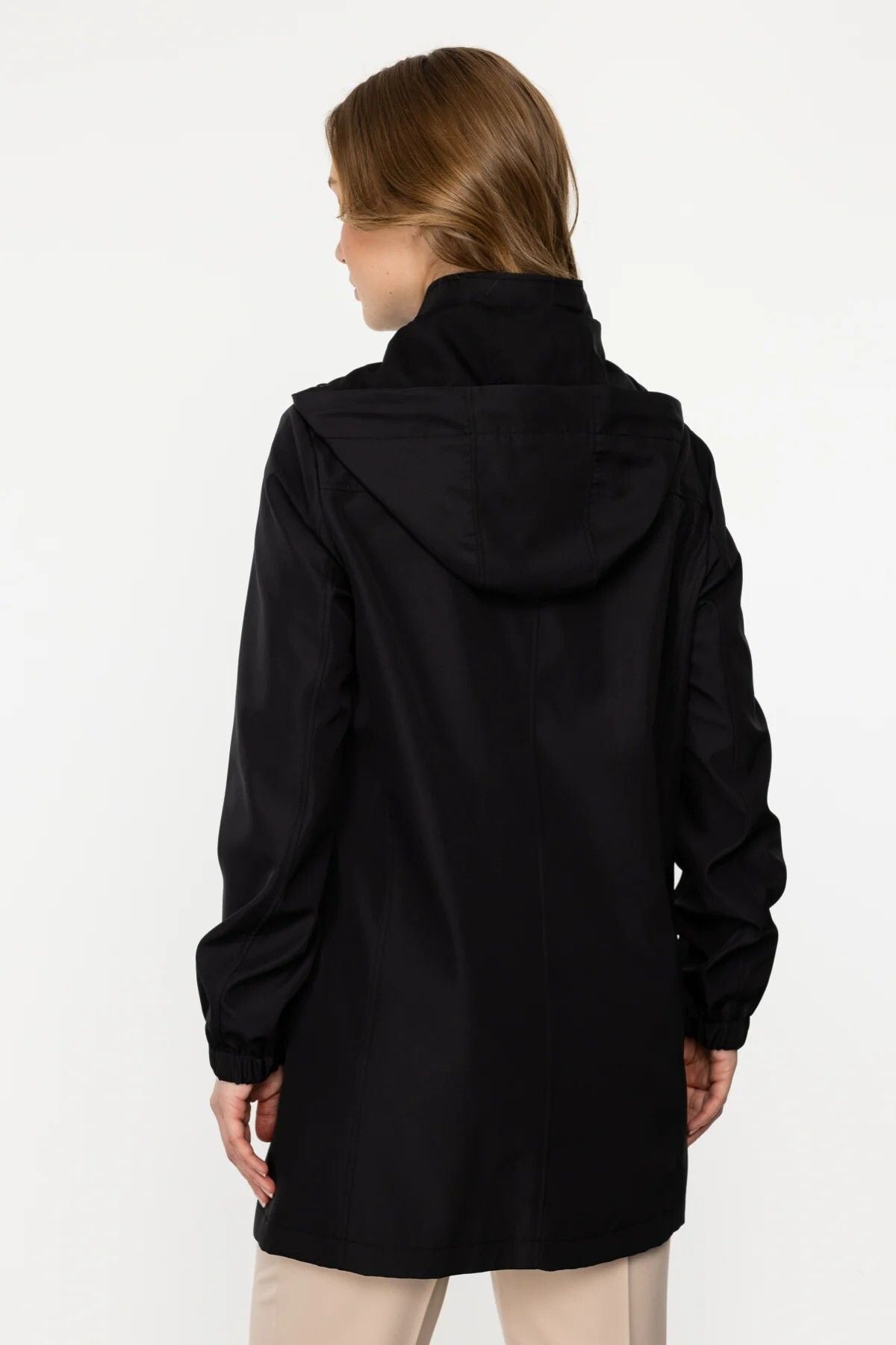 A thin trench coat with a front zipper, eyelet details on two flaps, two side pockets, long sleeves, epaulets on the sleeves, and a hood. 100% polyester; Model Height 177cm Model Measurements 87/63/92; Sample Size 38/S/1; Product dimensions: front 75 cm, back 81 cm;