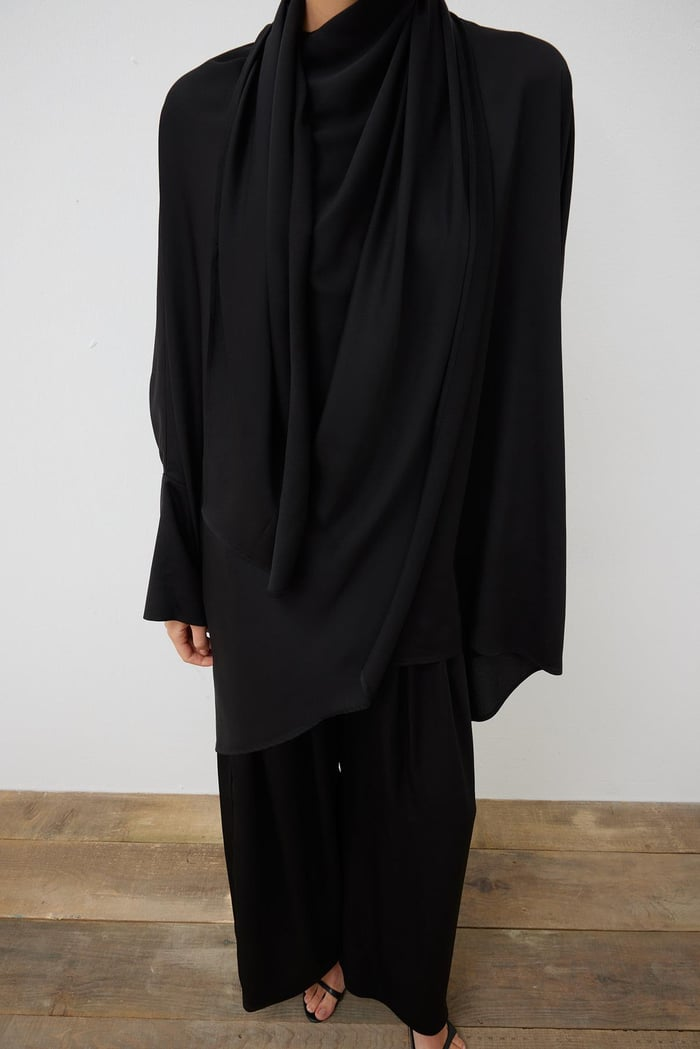 Product Description: The shirt has a shawl detail around the neck.