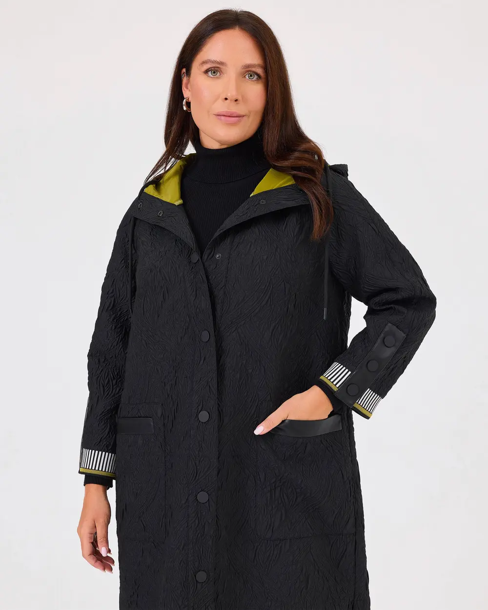 This plus-size patterned hooded trench coat adds a touch of freshness to your everyday style with its comfortable fit and practical hood. A perfect choice for a comfortable look!