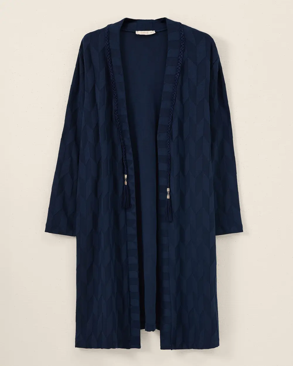 This plus-size patterned cardigan with tassel details adds a touch of style to your everyday look with its modern patterns and tassel accents.