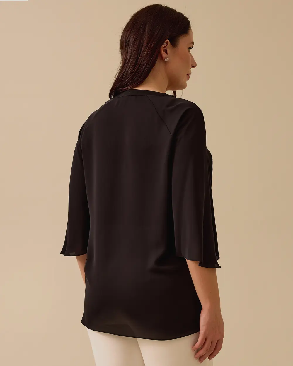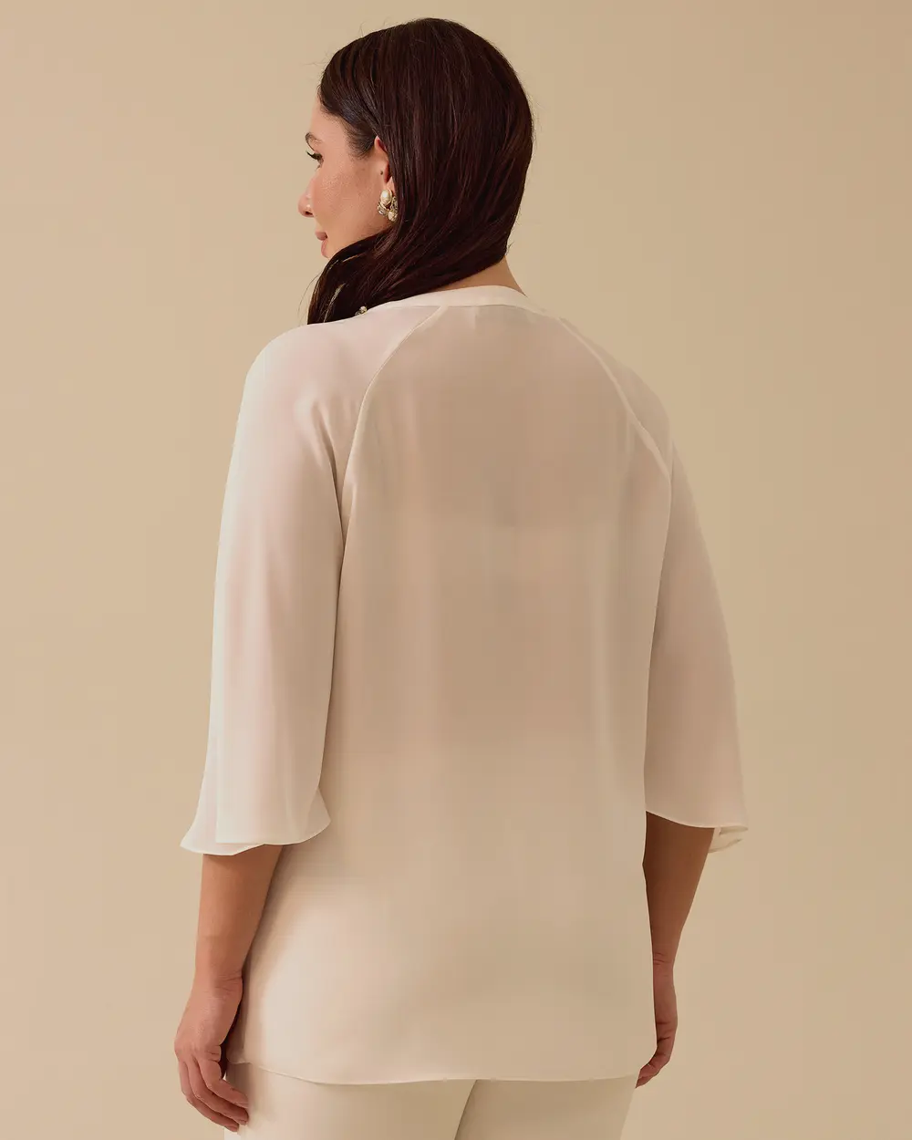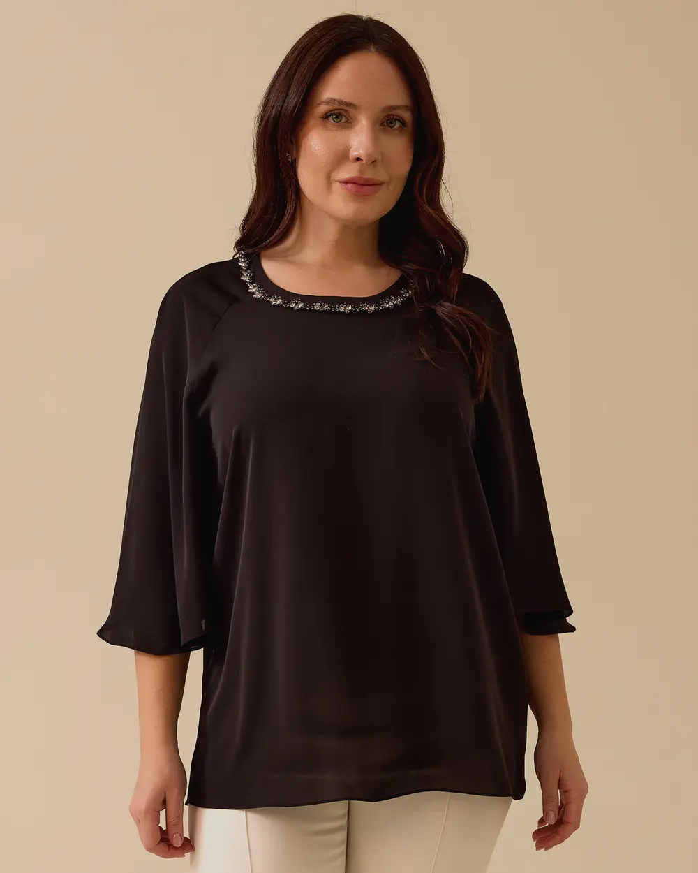 This plus-size crepe blouse with stone embellishments offers a comfortable and stylish look with its elegant stone details and flowing crepe fabric, making it suitable for any style.