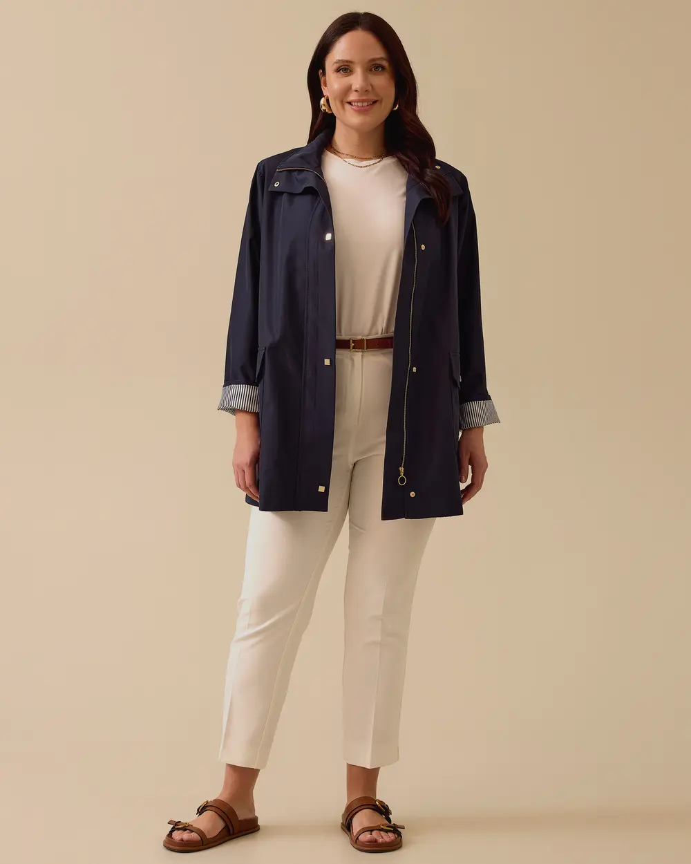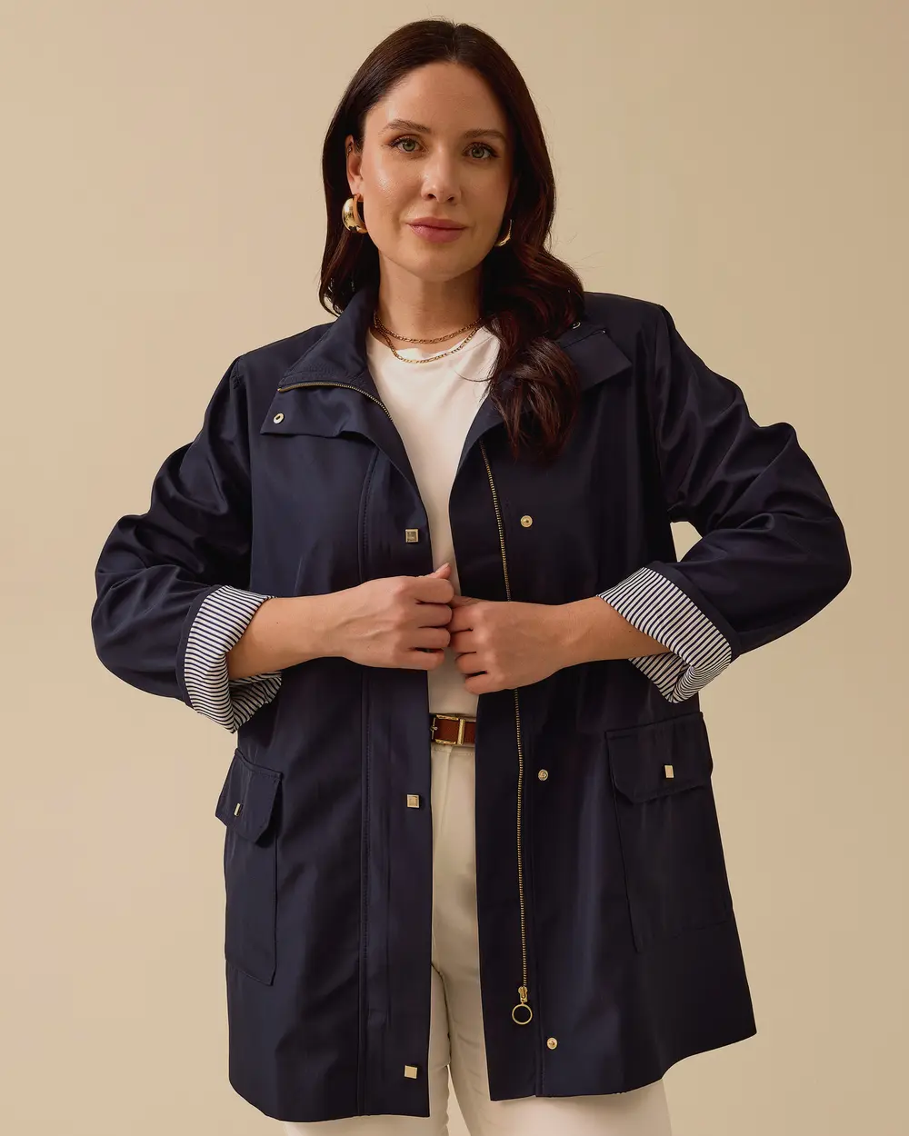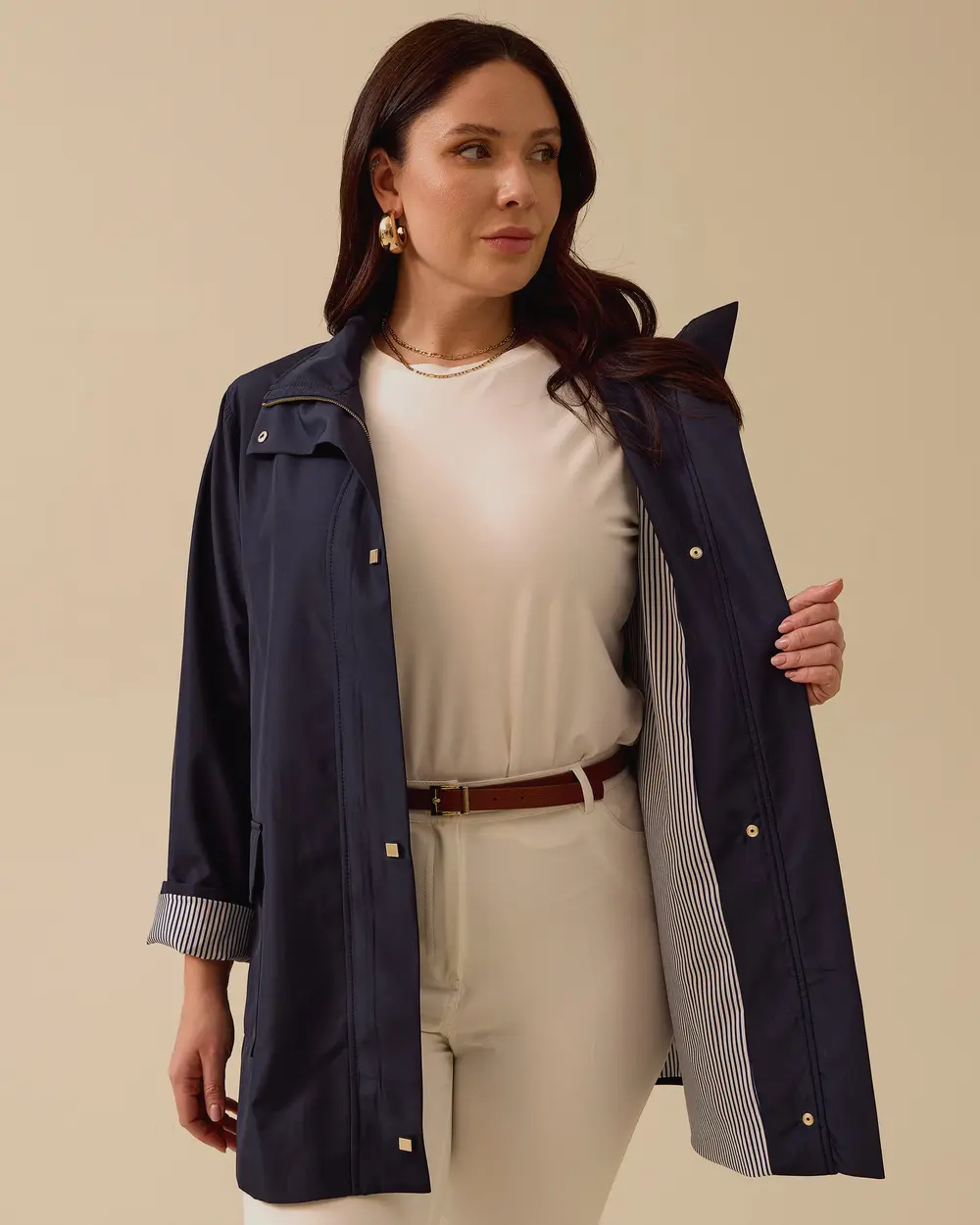 This plus-size striped-lined trench coat with pockets combines style and functionality with its striped lining and practical pockets. Its lightweight construction makes it ideal for transitional seasons.