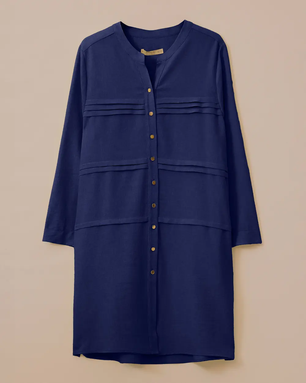 This plus-size button-down tunic with pocket details offers comfort with its relaxed fit and practical pocket details. Its stand-up collar and button-down design make it suitable for everyday wear.