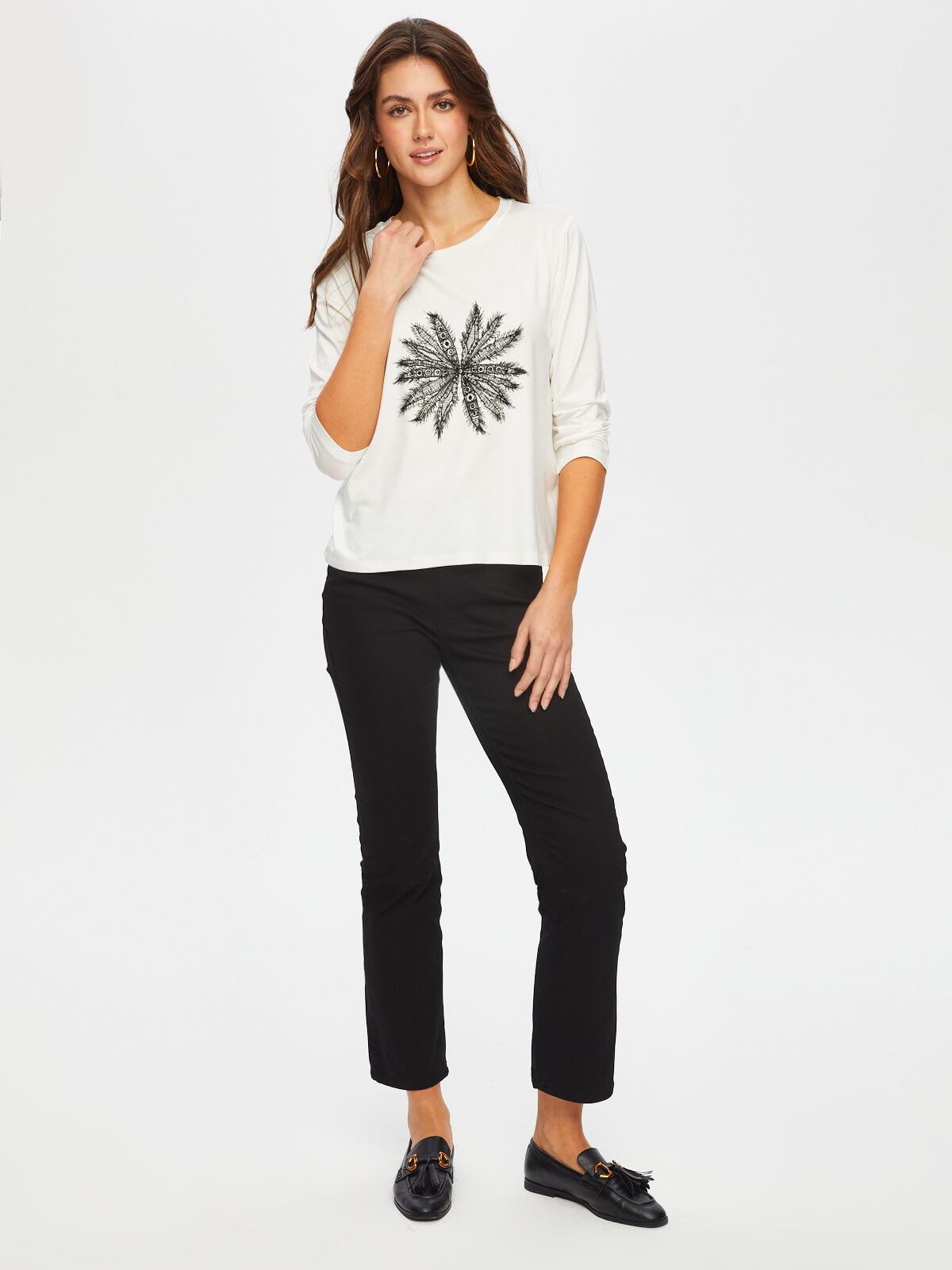 Women's Round Neck T-Shirt with Floral Lace Applique on the Front - Faik Sönmez
