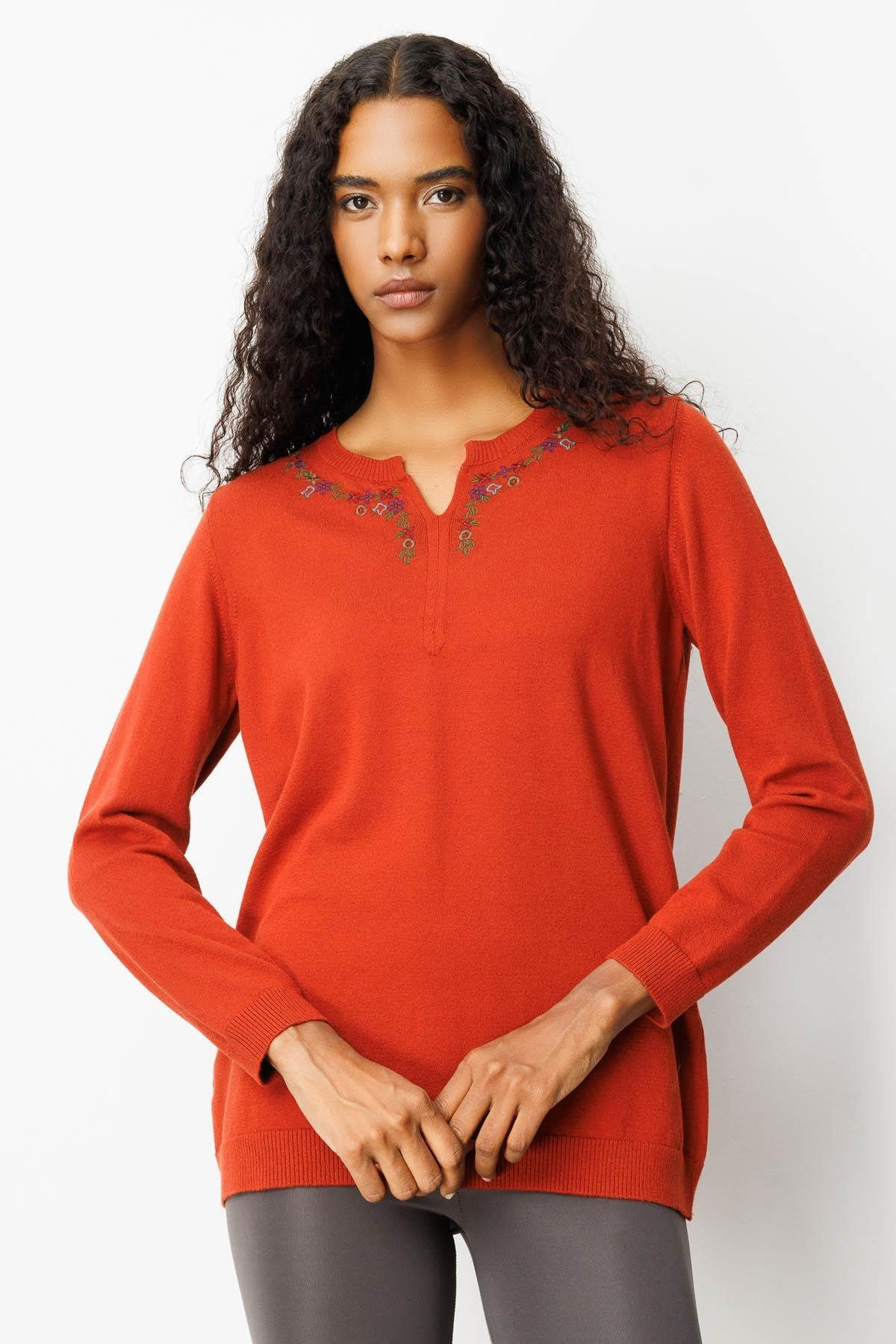 Women's Crew Neck Blouse with Floral Embroidery Pattern