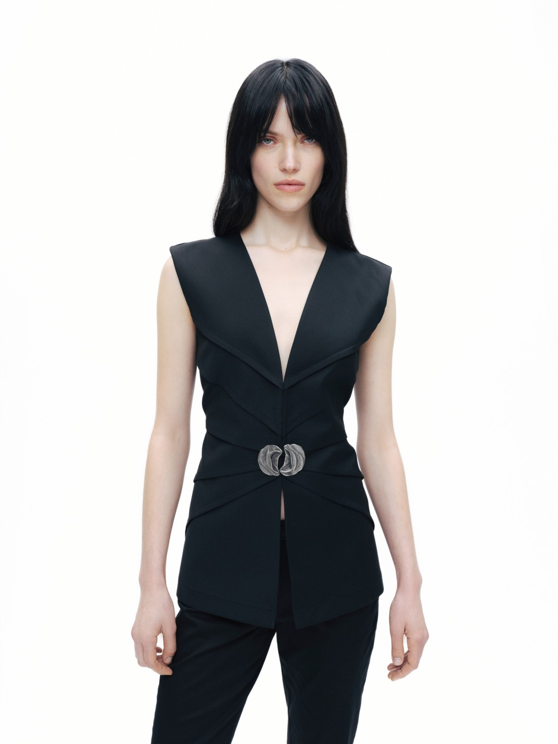 Product Description: Regular fit, true to size, lined, concealed hook closure, V-neck, pleated vest with metal accessory details.
