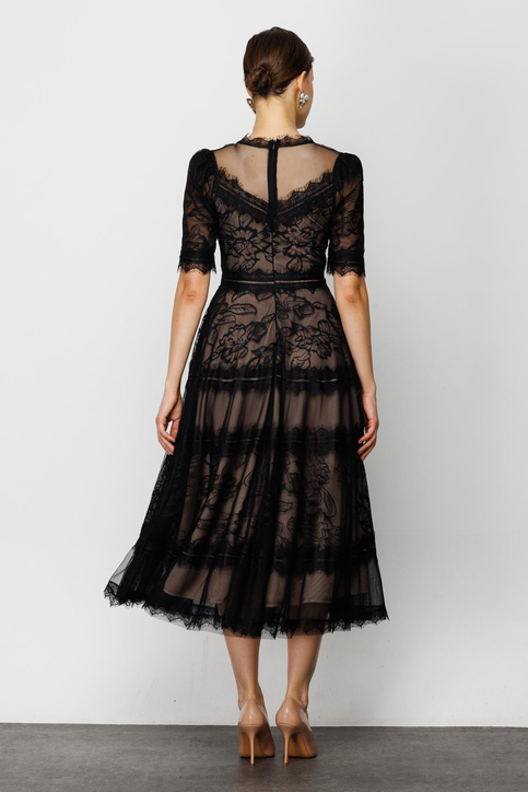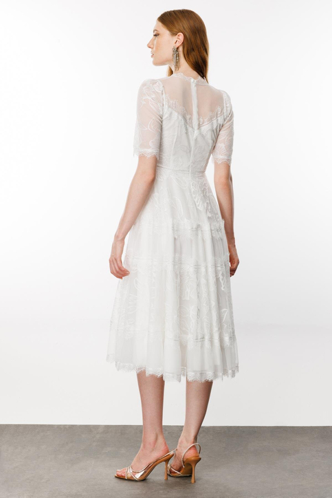 The product is made entirely of hand-crafted tulle lace. Thanks to its lining, it does not reveal body contours.