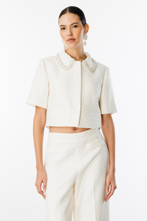 Stunning Details: The Peter Pan collar and embellished trousers with rhinestones will turn heads in any setting.