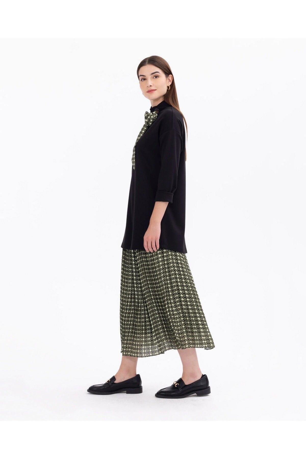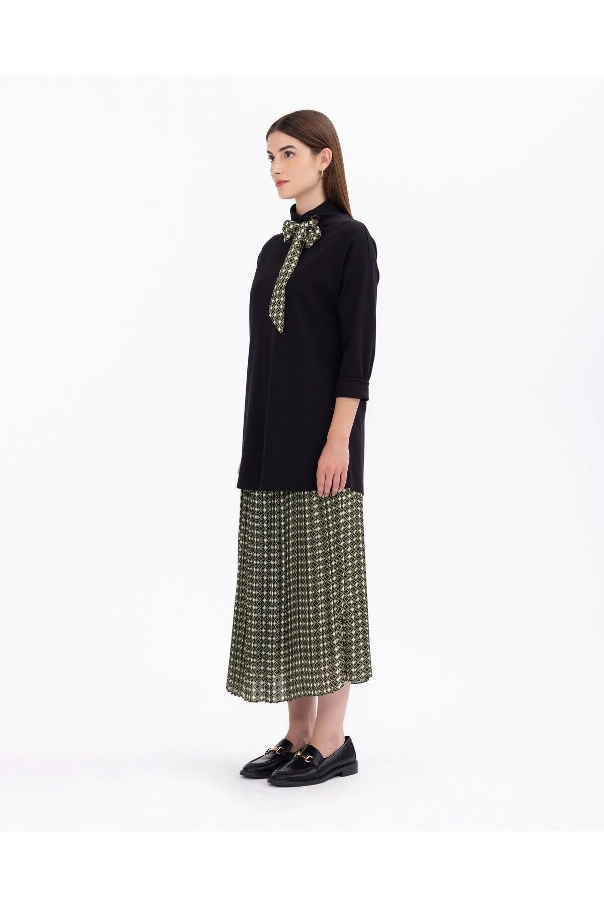 High Collar Tunic with Collar Detail brings elegance and elegance together. This special design attracts attention with its stand-up collar enriched with fine details. Thanks to its quality fabric, it offers comfort and elegance together. It is a perfect choice for special moments as well as for daily use. It emphasizes your elegance with its body-compatible cut; Product features; Binding Detailed Long arm Collar Detailed Size Below Hips Two Fabric Fabric Content; 20 Polyester 10 Elastane 70 Viscose Model Measurements; Sample Size: 38 Model Height 177 Dimensions: 86 / 62 / 92