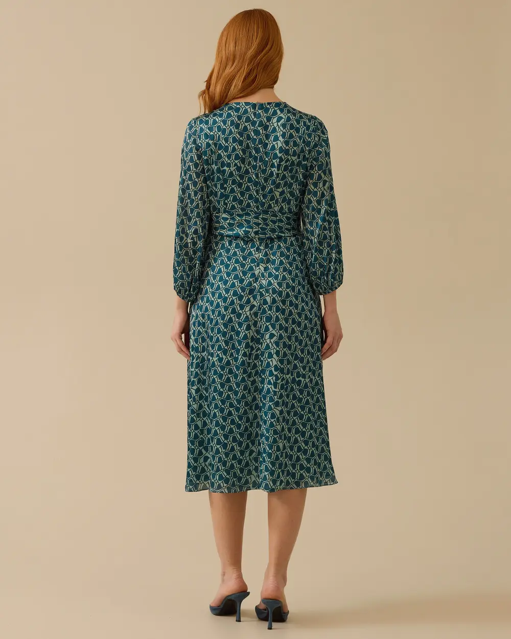This V-neck patterned dress with belt detail is suitable for both everyday wear and special occasions, thanks to its elegant design and comfortable fit, and the belt detail adds a sophisticated touch.