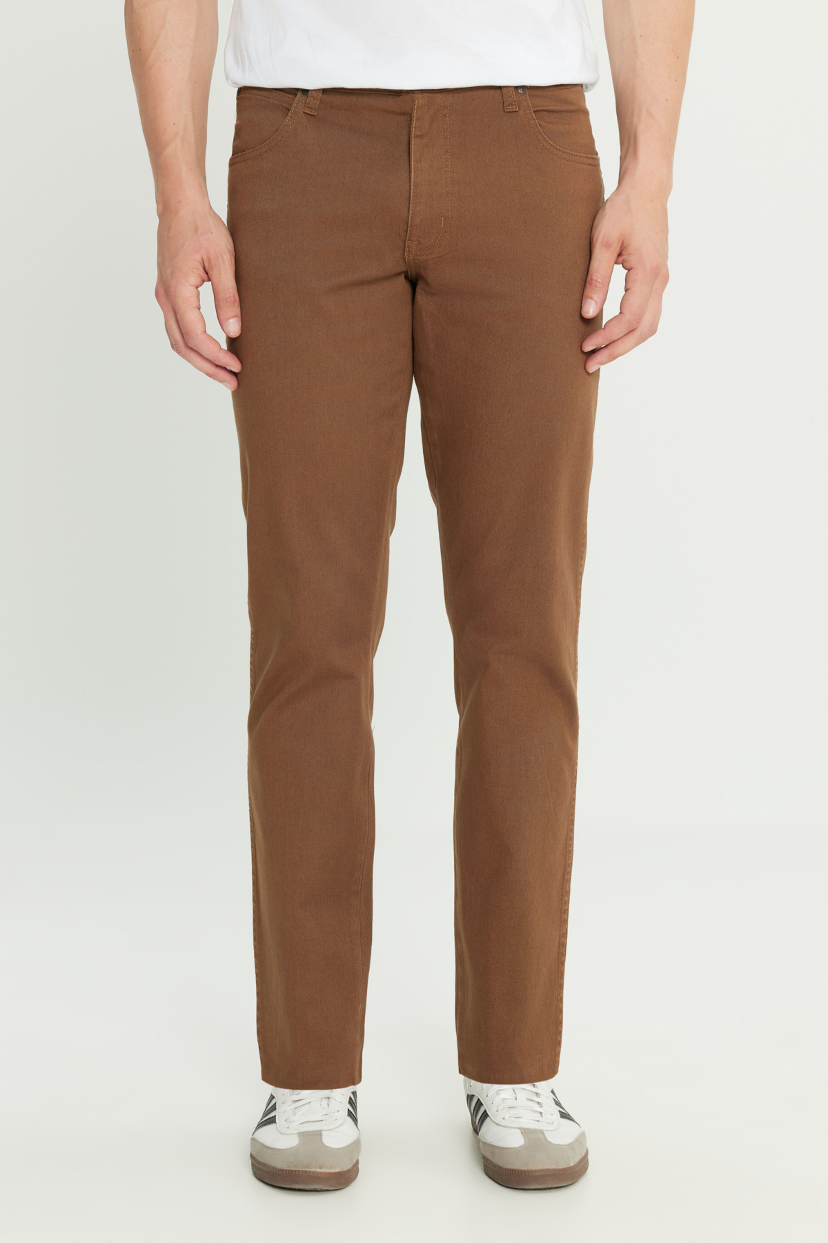 Model Information: Size: M Height: 186 cm Chest: 98 cm Waist: 80 cm, Fabric Information: 98% Cotton 2% Elastane, Color: Saddle Brown, Fit: Straight Fit, Leg Style: Straight Leg, Waist: Regular Waist, Gender: Male, Product Name: Straight Fit Straight Cut Regular Waist Light Brown Stretch Texas Authentic Pants, Product Code: W121053248.