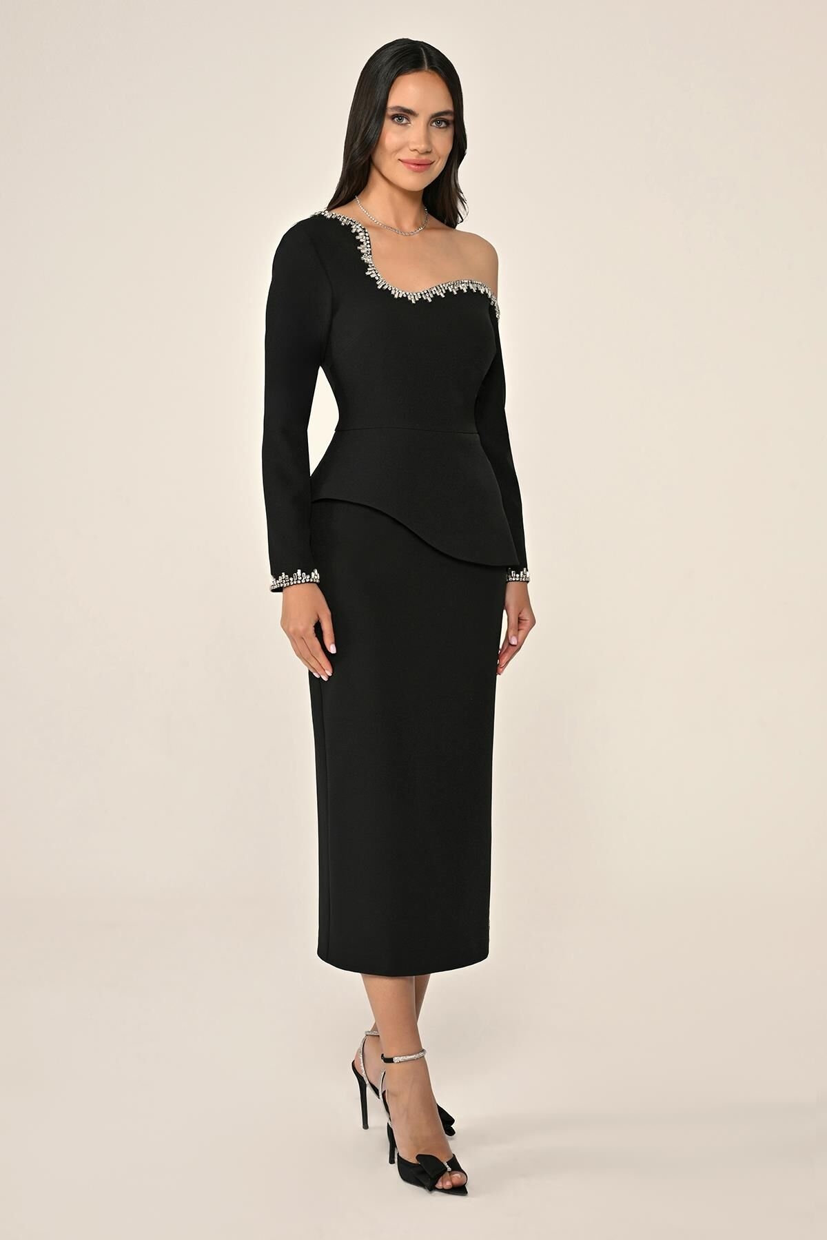 Asymmetrical Top Embellished Crepe Midi Evening Dress Alfabeta