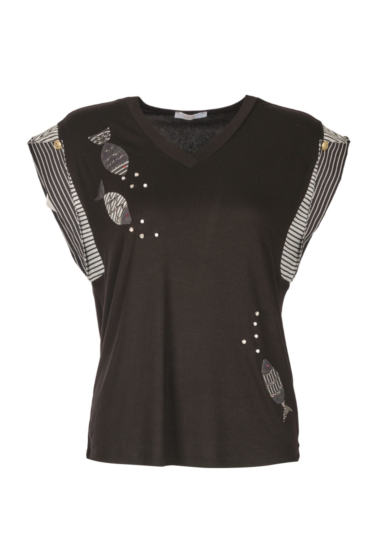 Product Features: Brand: Vedi; Model: T-shirt; Season: Spring/Summer Material: 95% Viscose 5% Elastane; Neckline Information: V-neck; Sleeve Information: Short Sleeve; Fit Information: Regular Fit; Model Measurements: Weight: 53 kg / Height: 1.80 cm / Bust: 87 cm / Waist: 63 cm / Hips: 90 cm / Size: S