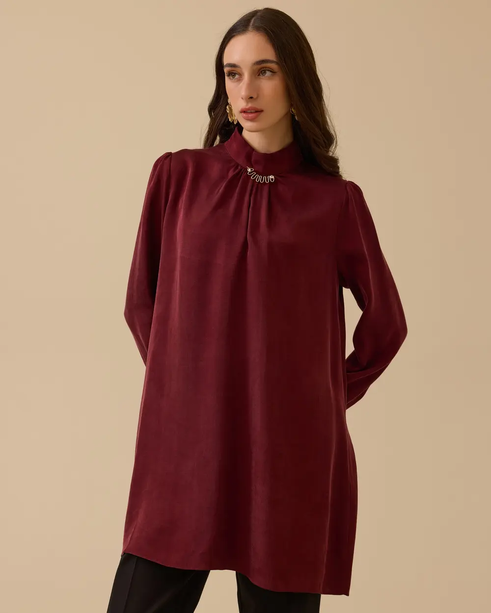 The tunic with collar detail and pleat accents creates elegant and stylish combinations with its modern design.