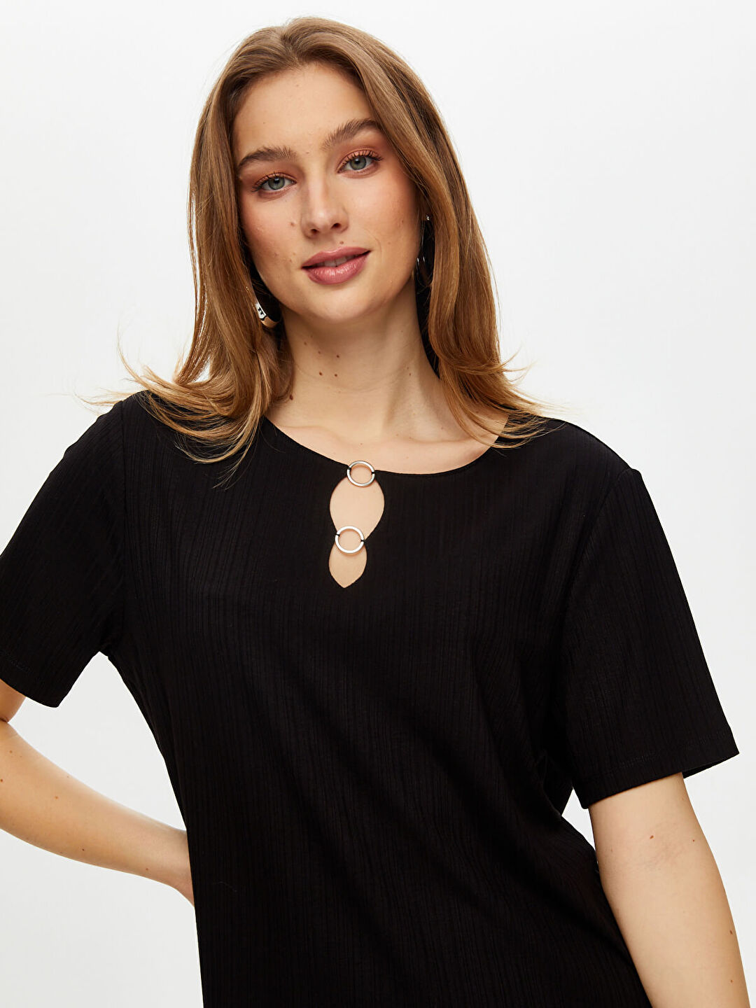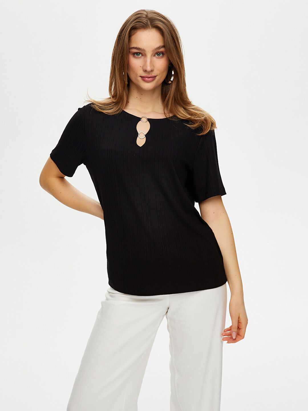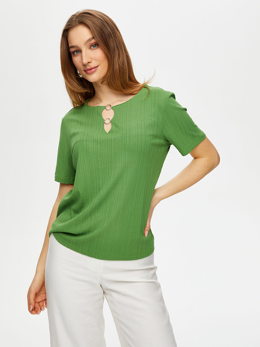 Short-sleeved knitted blouse with metal ring detail on the collar by Faik Sönmez