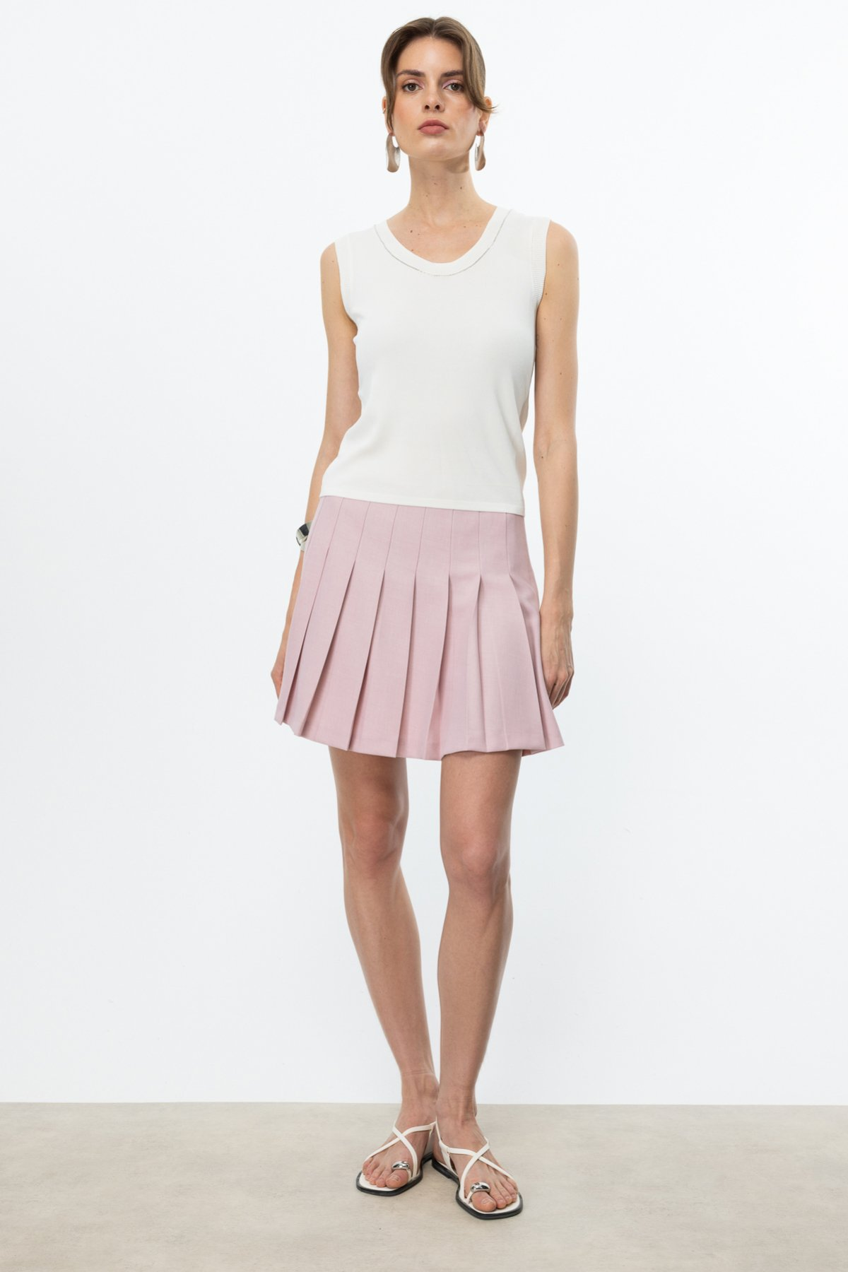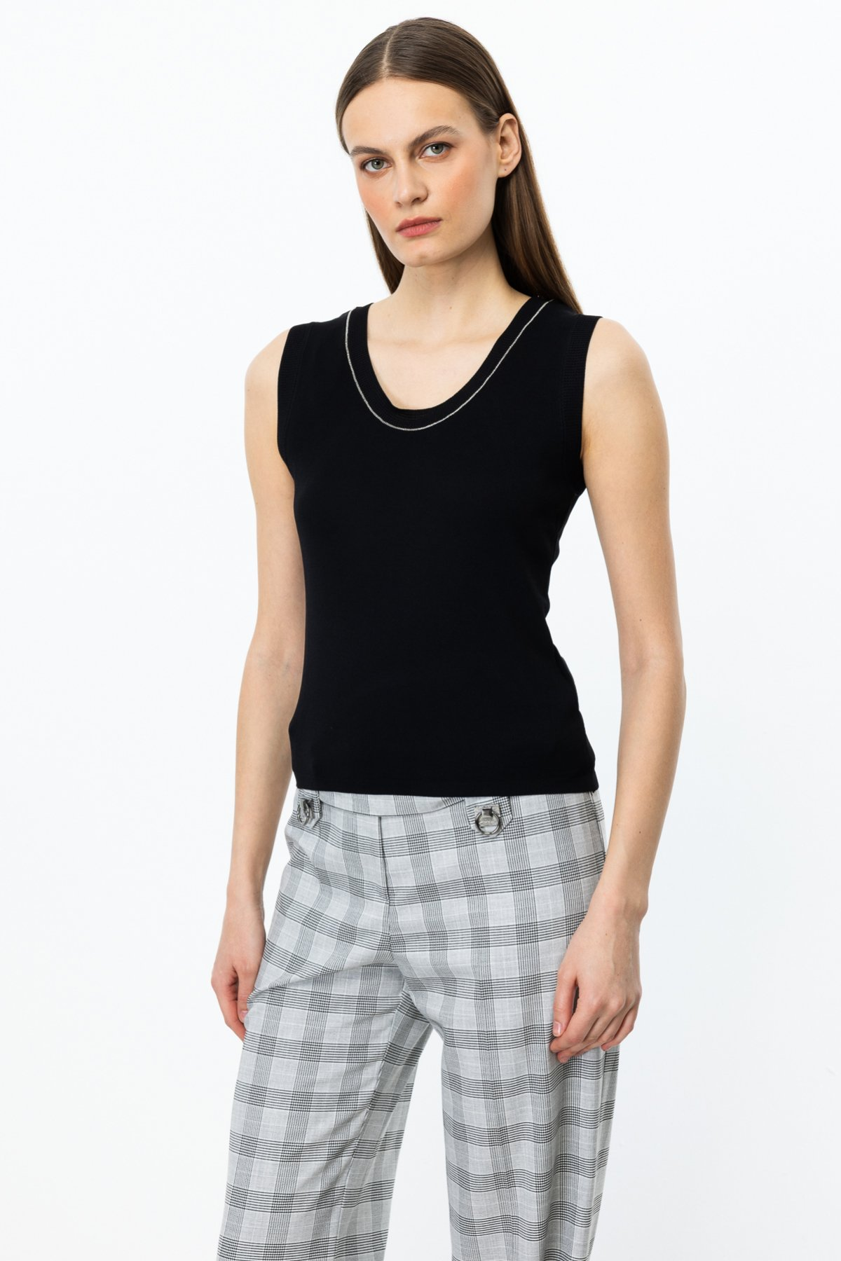 Product Specifications:  Crew neck, sleeveless, knitted fabric, with stone detailing around the neckline.