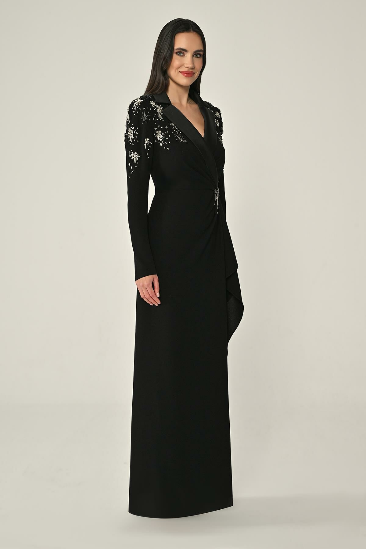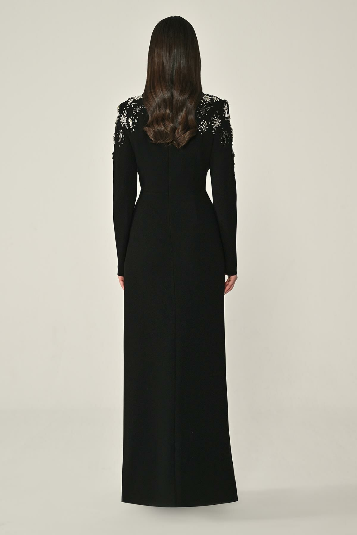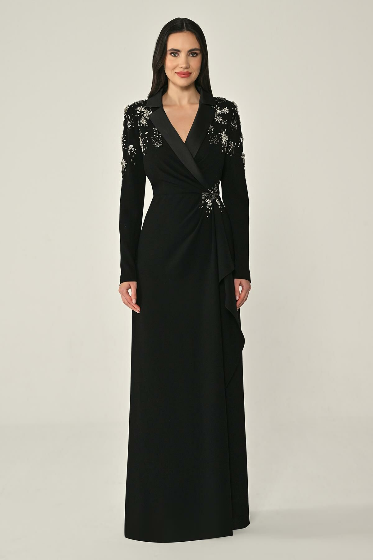Uzun Kollu Yakası Uzun Krep Abiye Elbise Alfa Beta