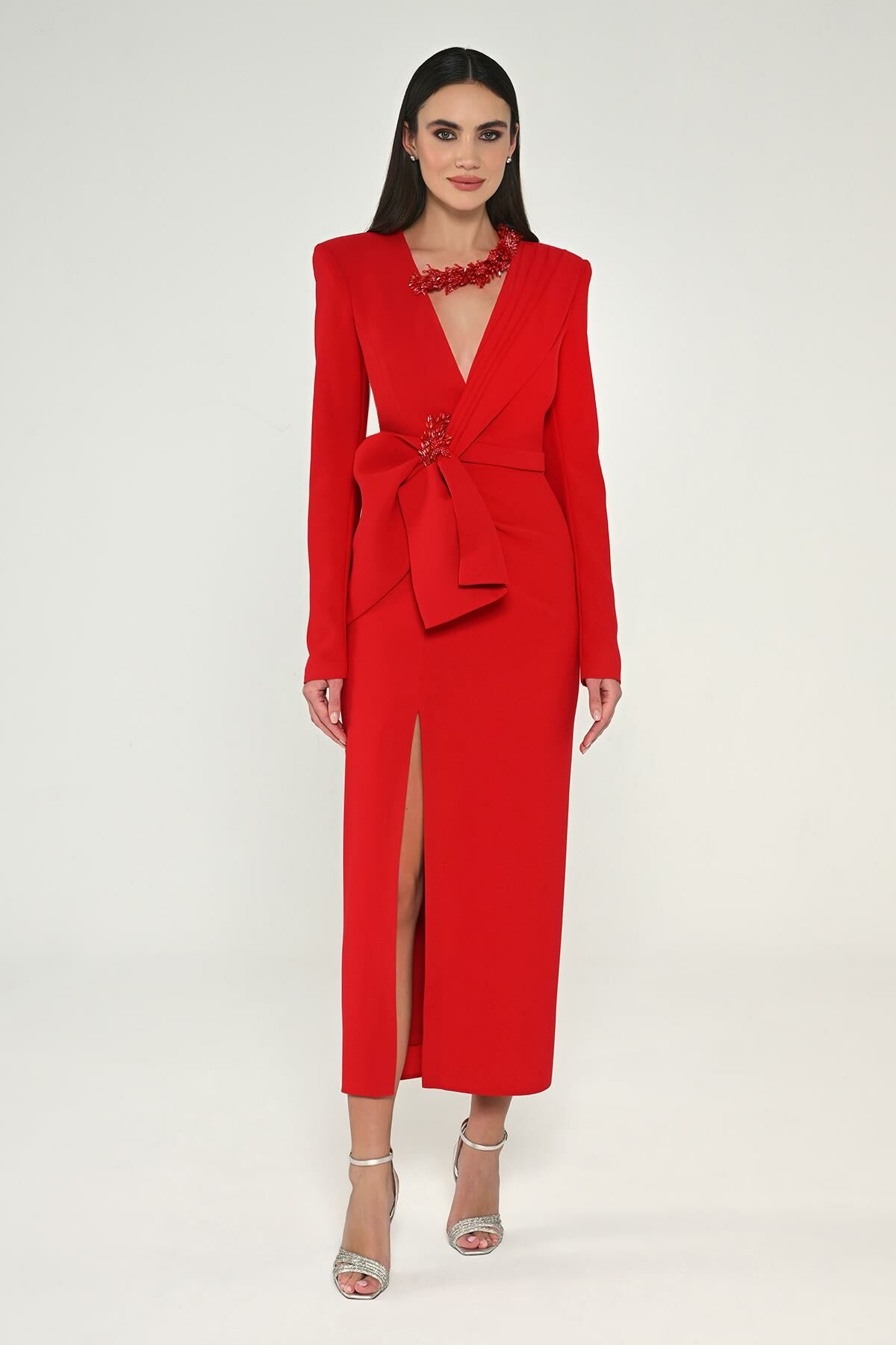 Alfa Beta Uzun Kollu Vatkalı V Midi Abiye Elbise 40-2 Kırmızı
