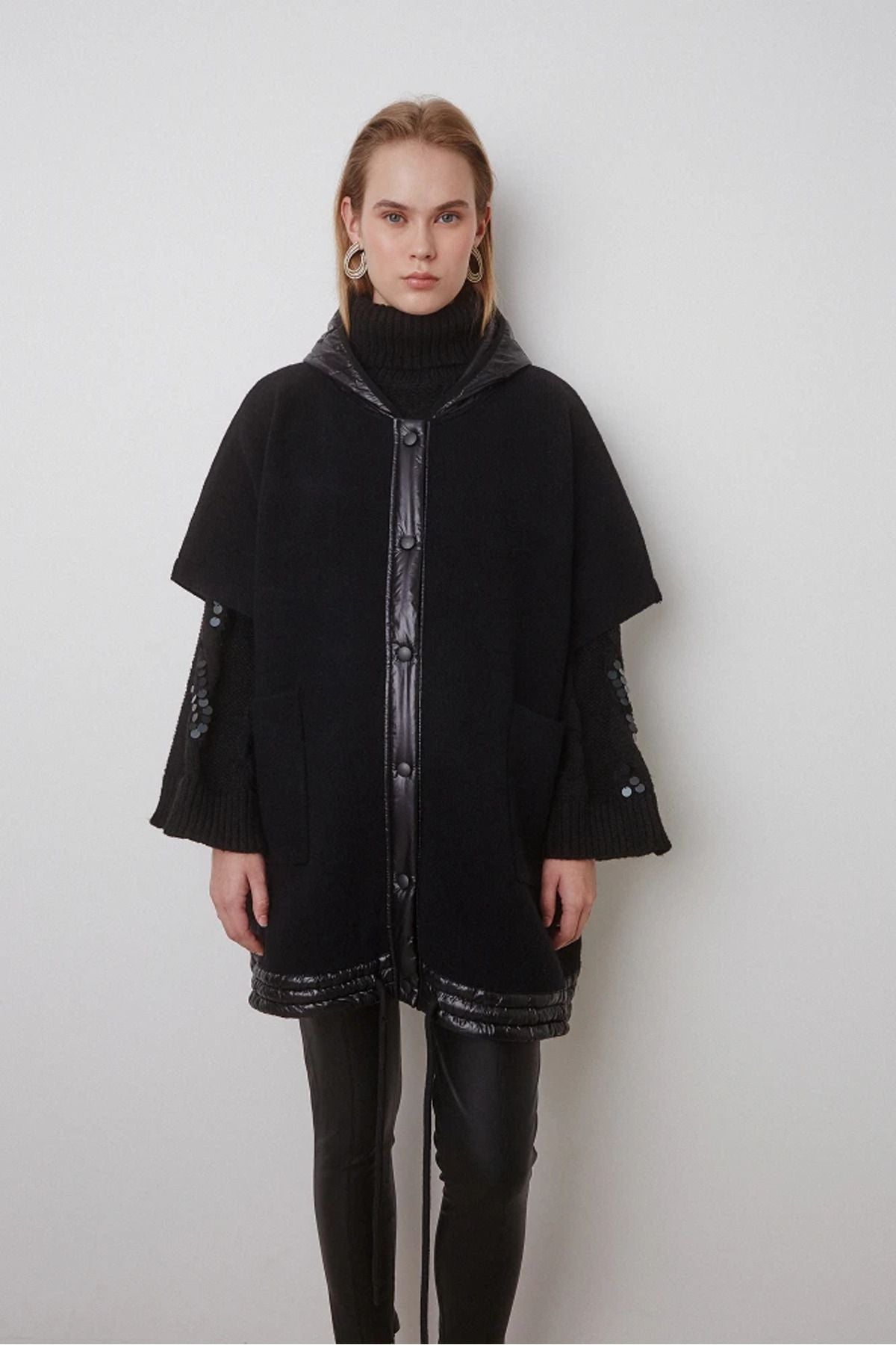 ÜRÜN DETAYLARI:; Kapüşonlu kısa kollu pelerin, kapüşonda, etek ucunda vinil detaylı, önü düğmeli, ön cepli, etek boyu...