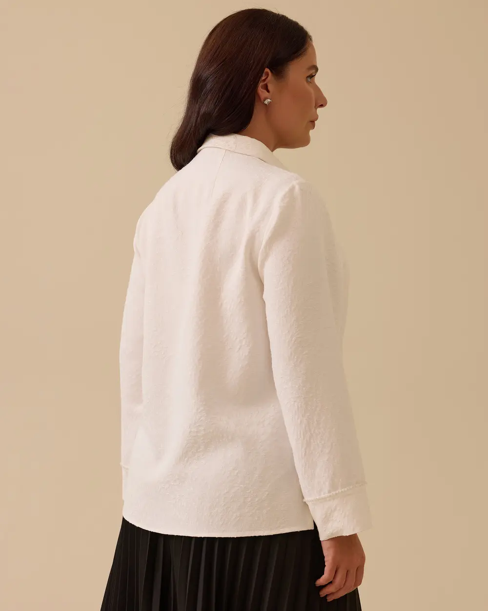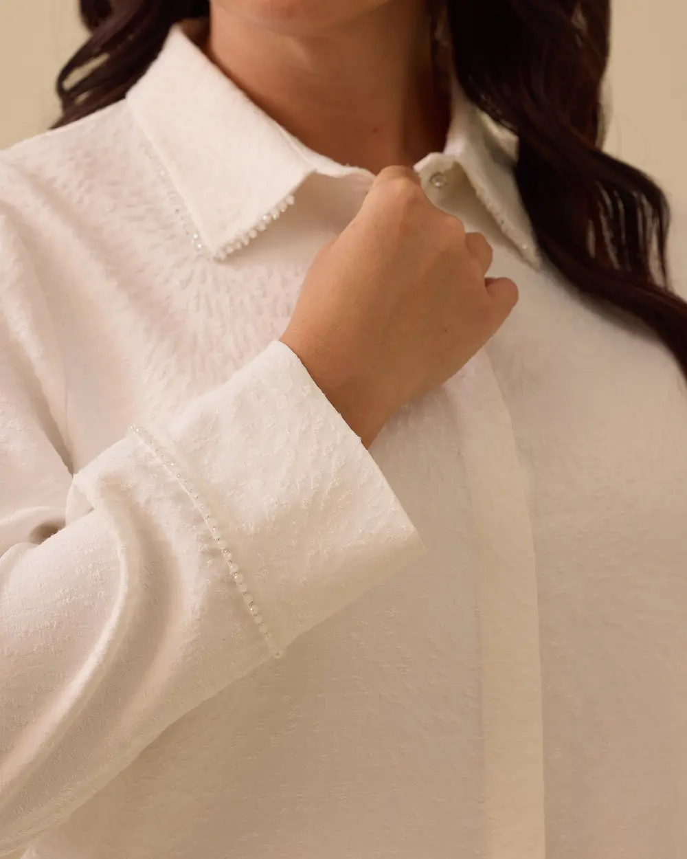 Büyük Beden Boncuk Detaylı Dokulu Gömlek, zarif işlemeleriyle şıklığı ve konforu bir arada sunar.