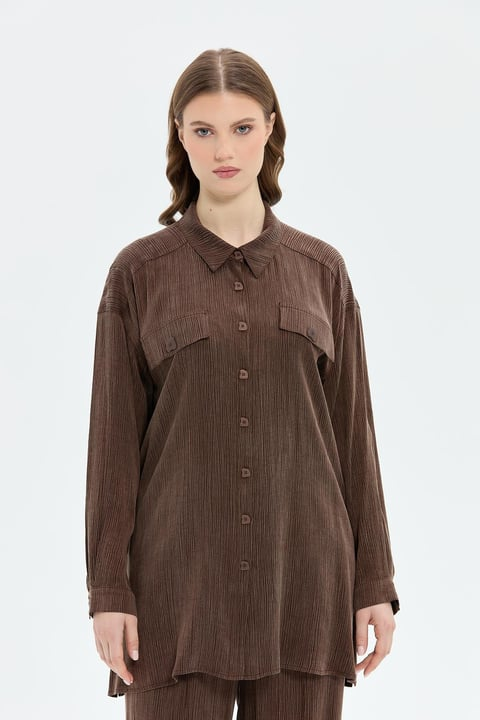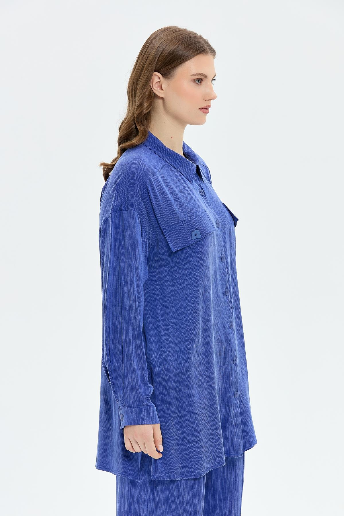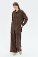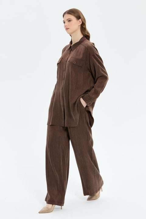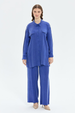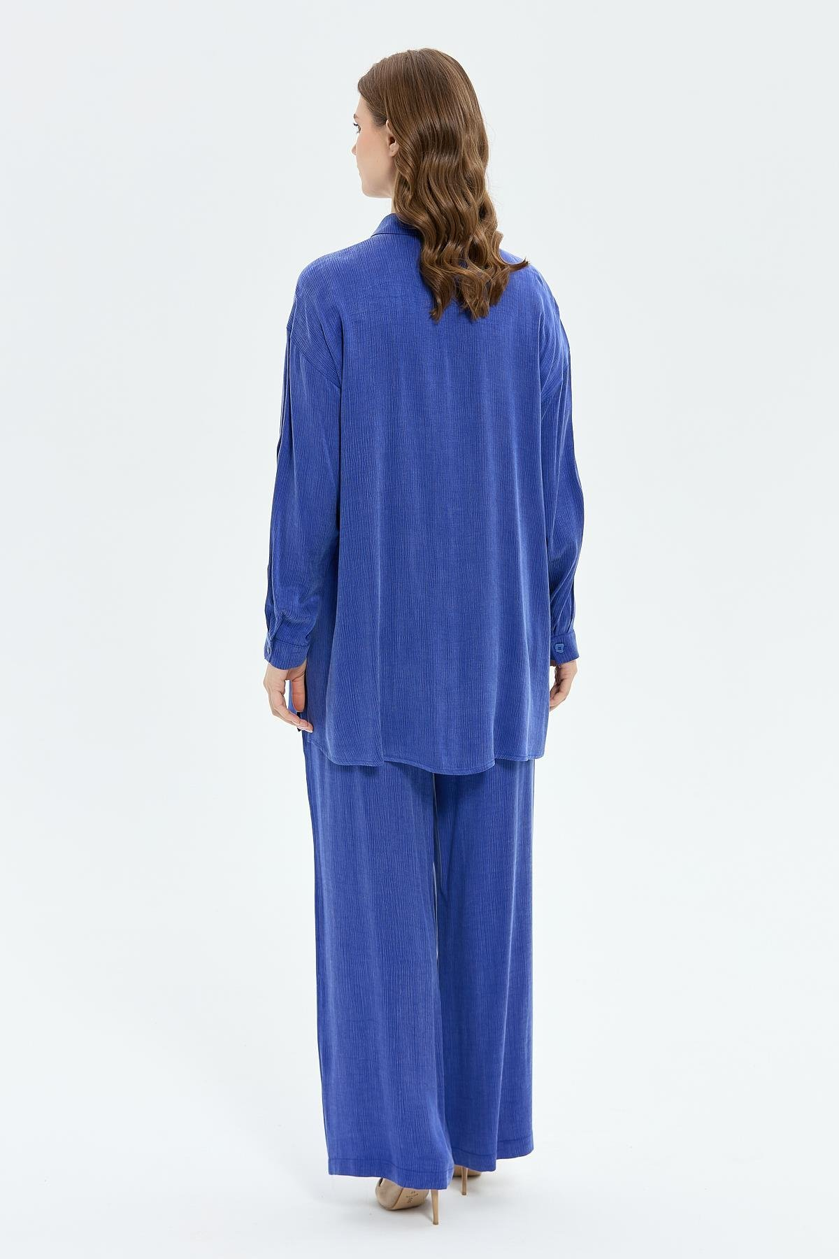 Dokuma ipek cupra kumaş Düğme kapamalı Beli lastikli pantolonlu takım Rahat kalıp Gömlek boyu: 85 cm Pantolon boyu: 108 cm