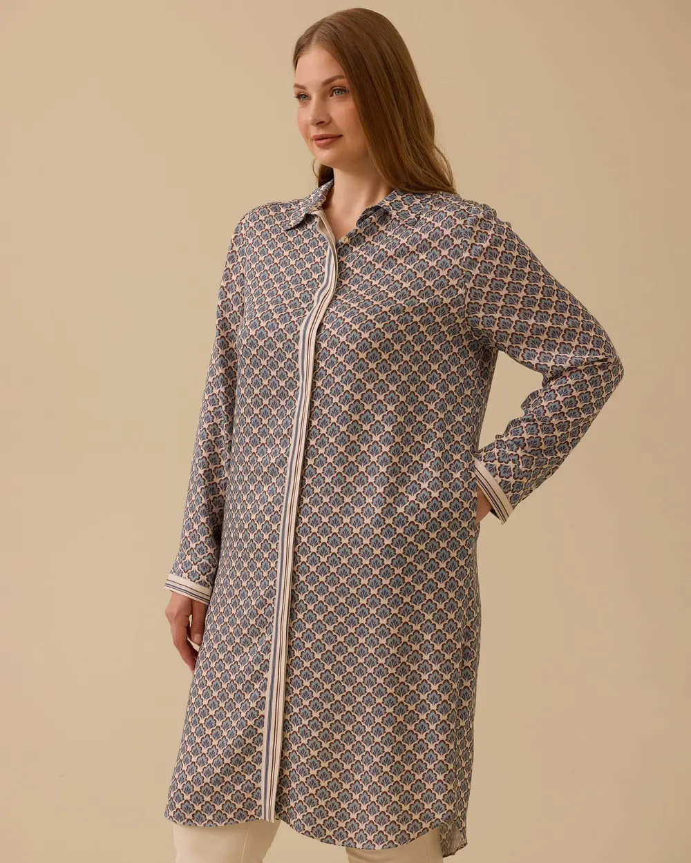 Büyük Beden Desenli Uzun Tunik, modern deseni ve uzun kesimiyle şık ve rahat bir görünüm sunar.