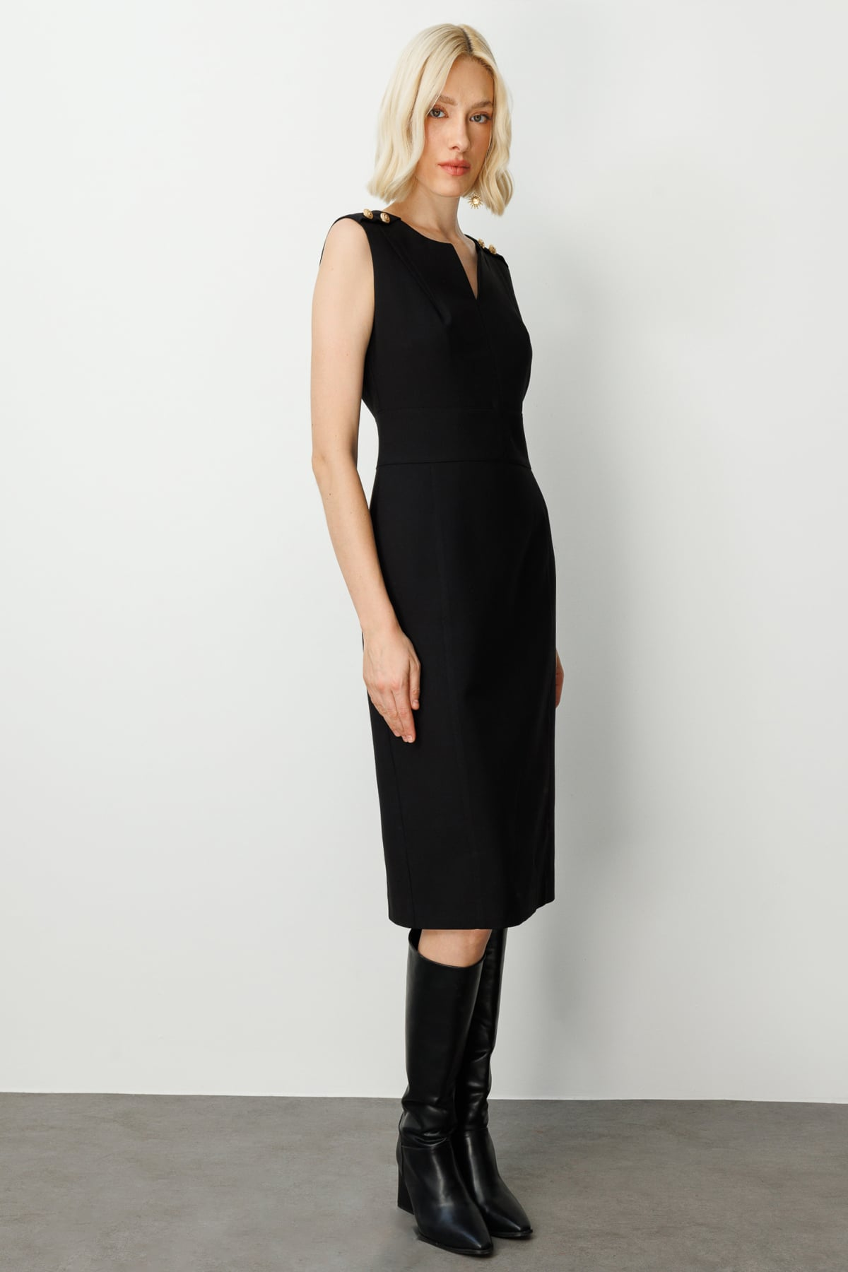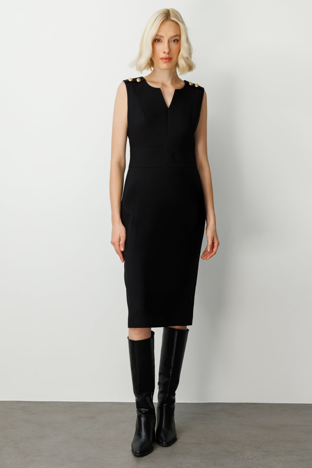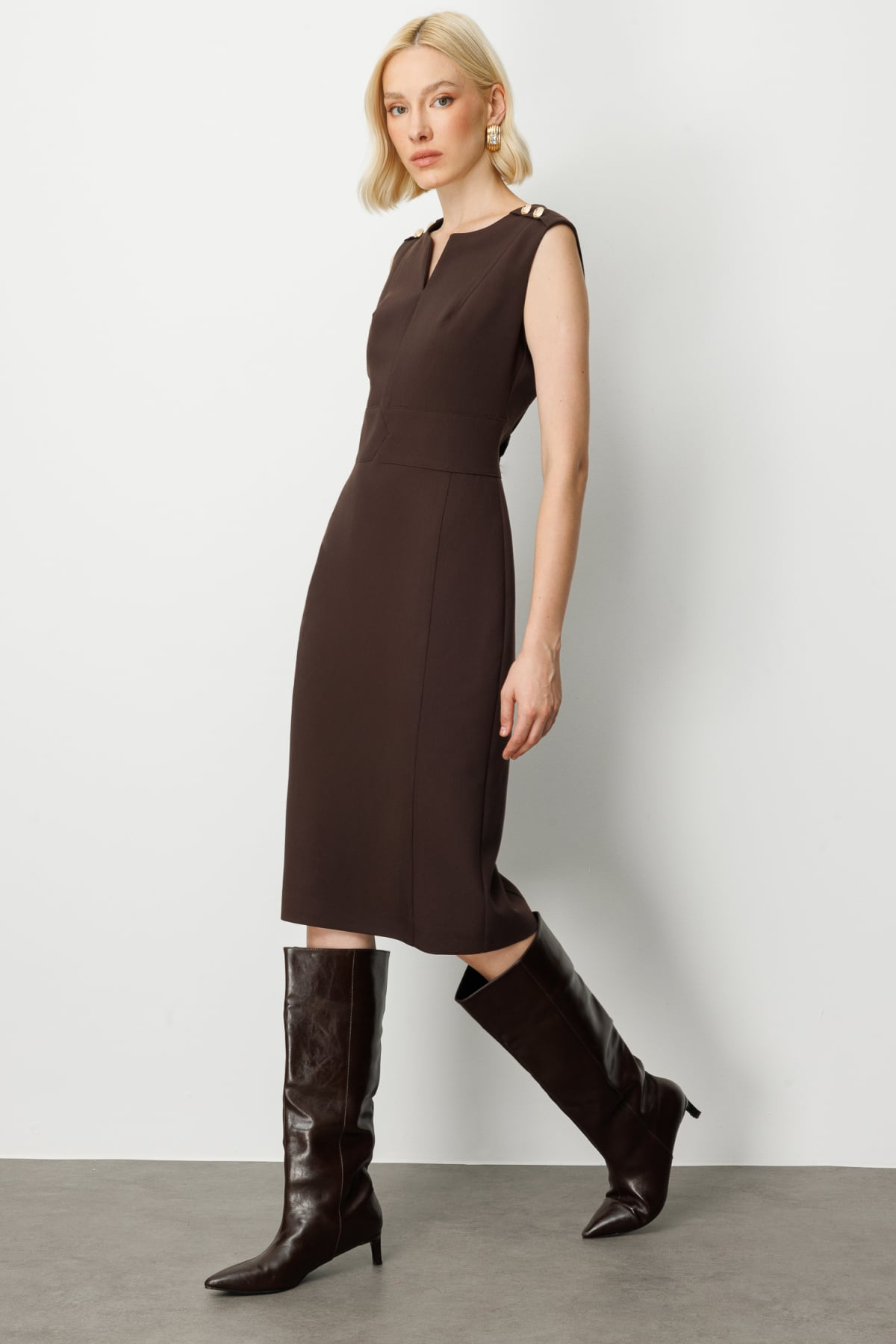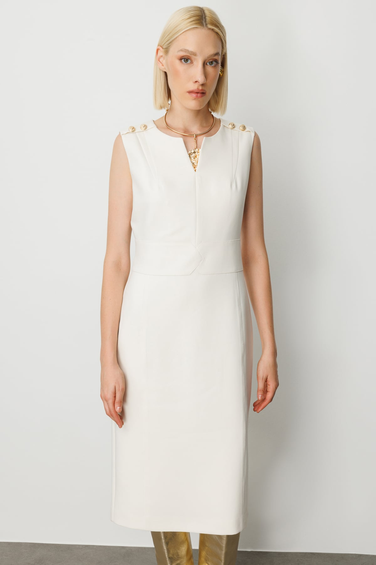 Ekol Minimalist Midi Elbise - Kolsuz V Yaka Günlük & İş Elbisesi