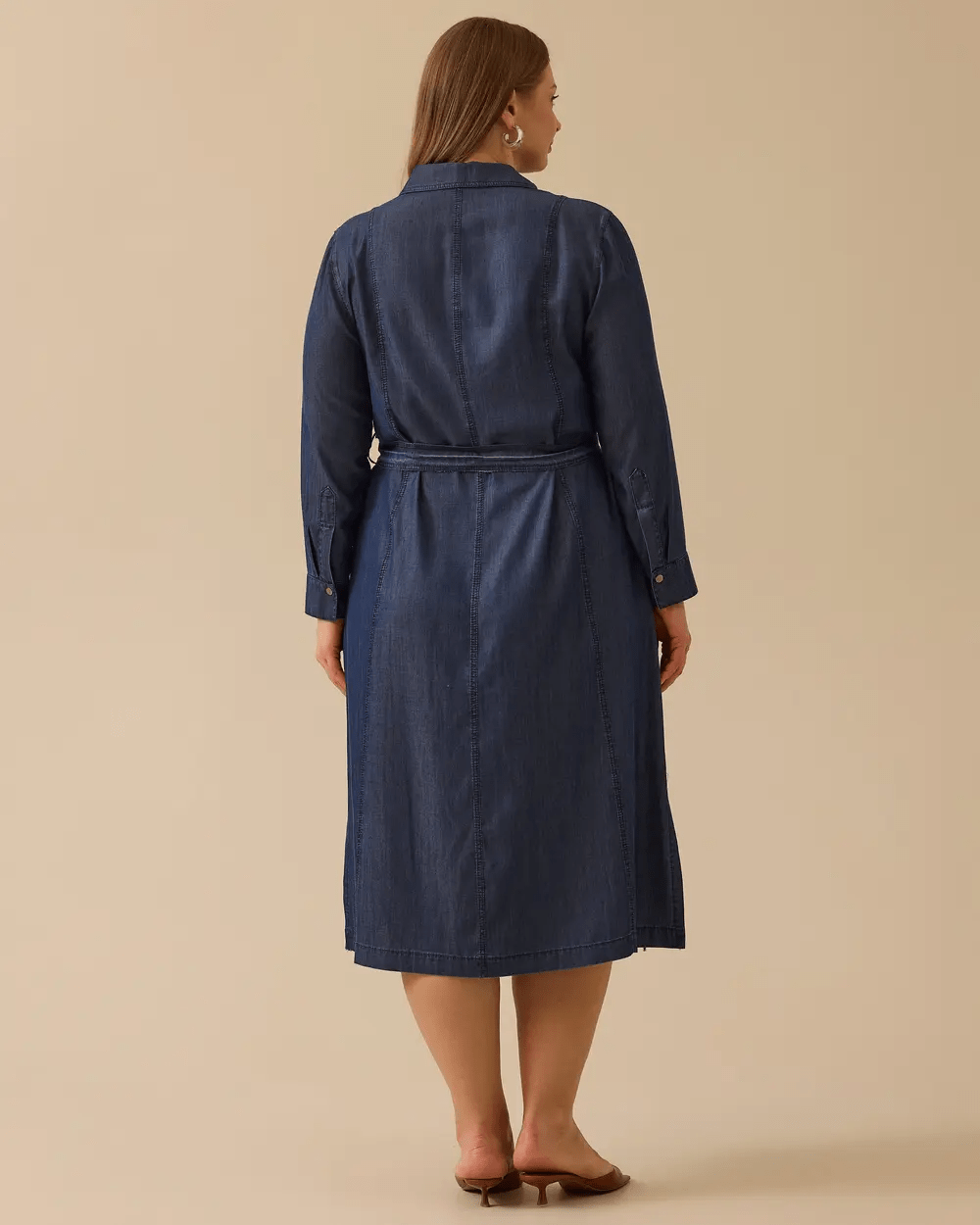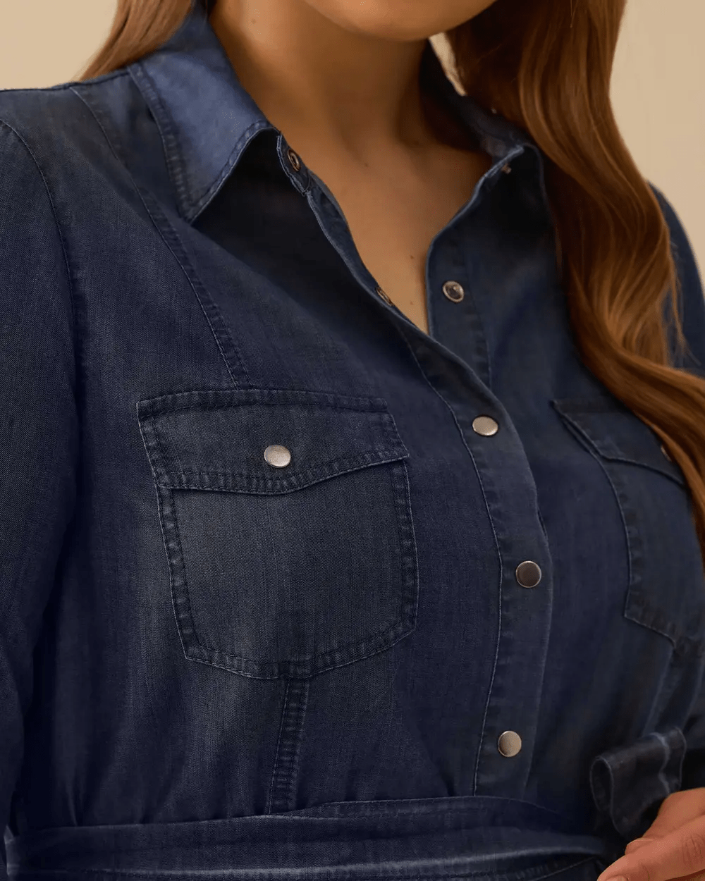 Büyük Beden Kuşaklı Jean Elbise, çıtçıt düğmeli tasarımı ve belden bağlamalı kuşağıyla şıklık ve rahatlığı bir araya getirerek modern bir görünüm sunar.