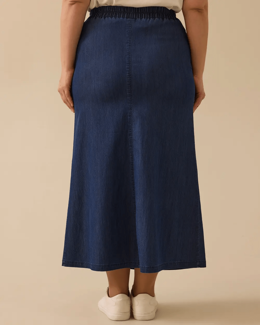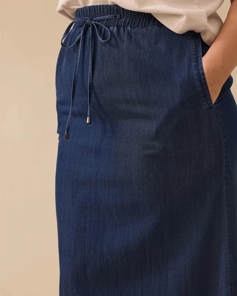 Büyük Beden Cepli Bağcıklı Jean Etek, lastikli beli ve cepleriyle rahat ve kullanışlıdır. Günlük şık kombinler için idealdir.