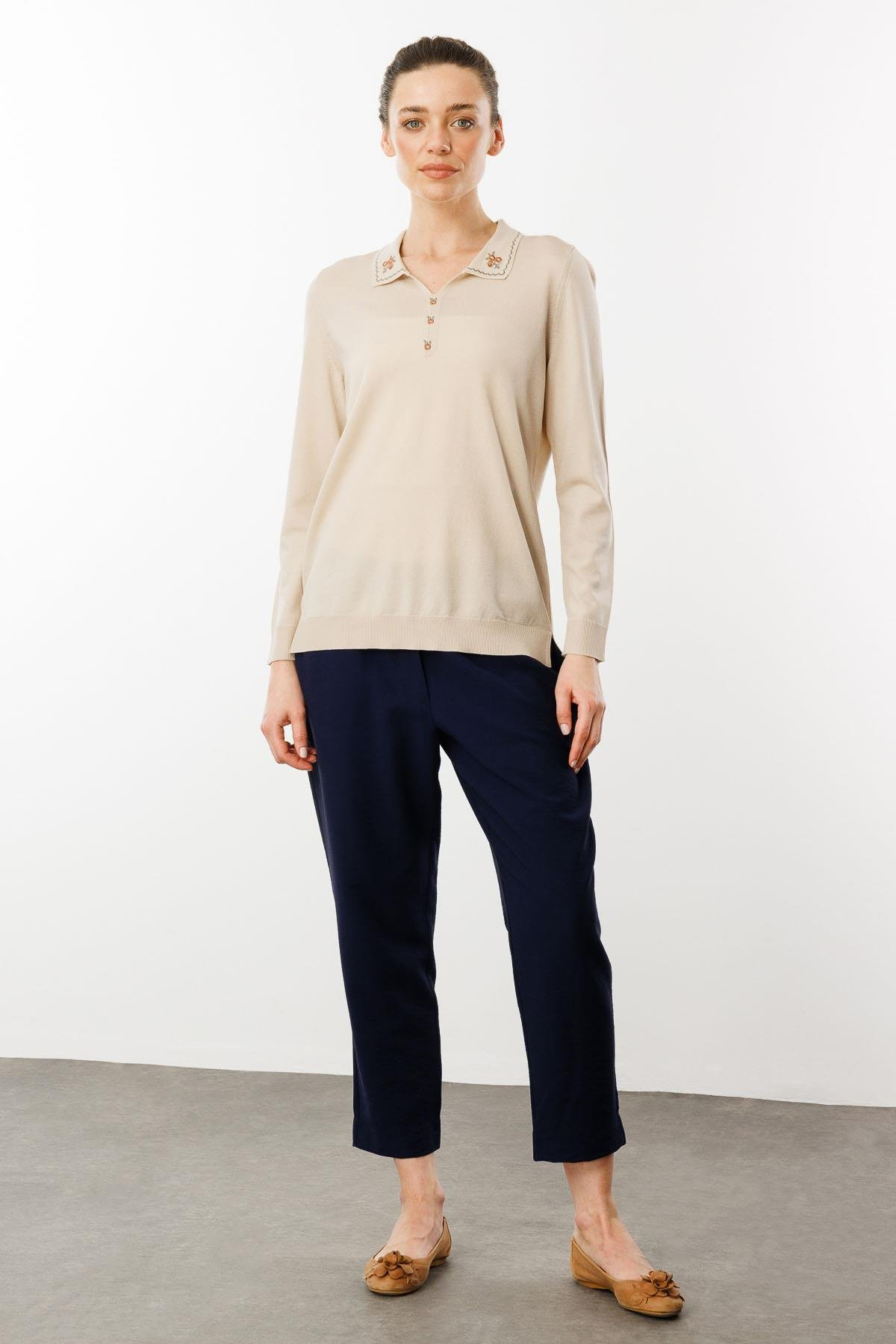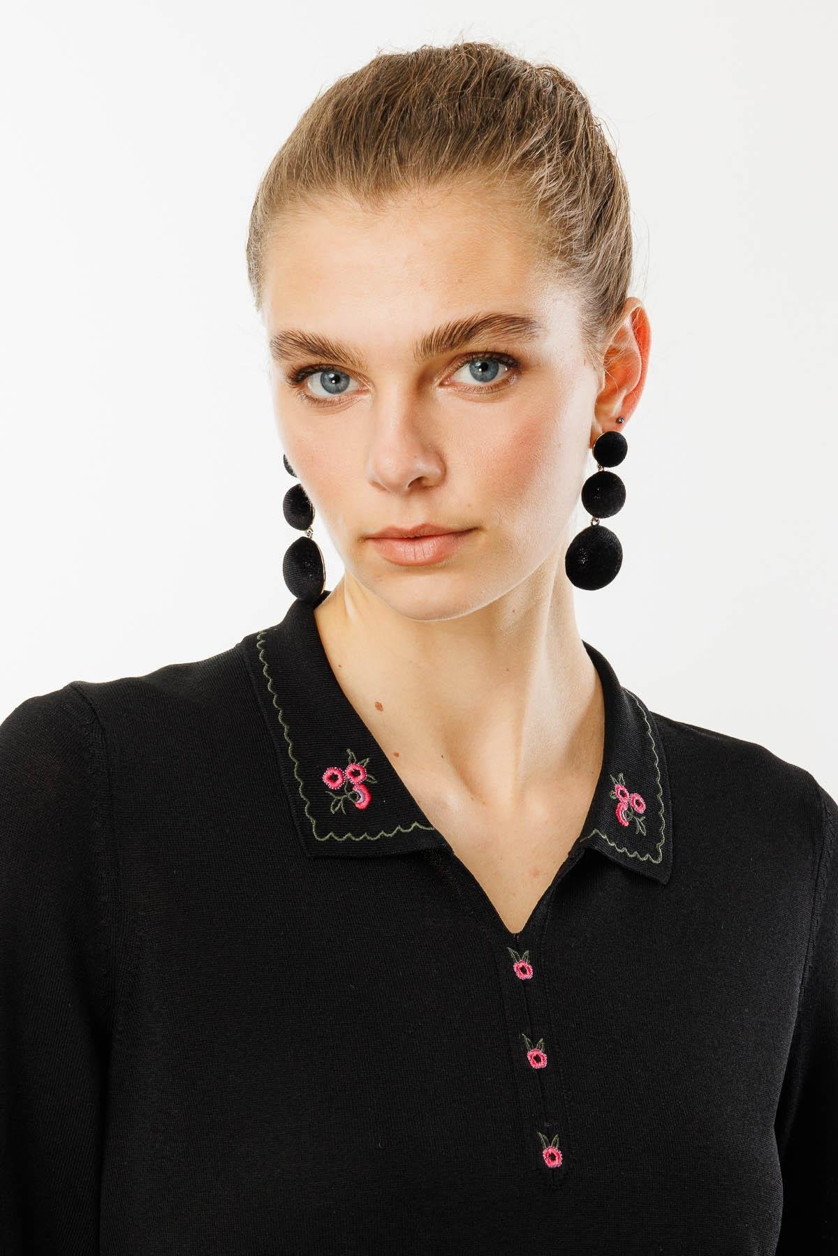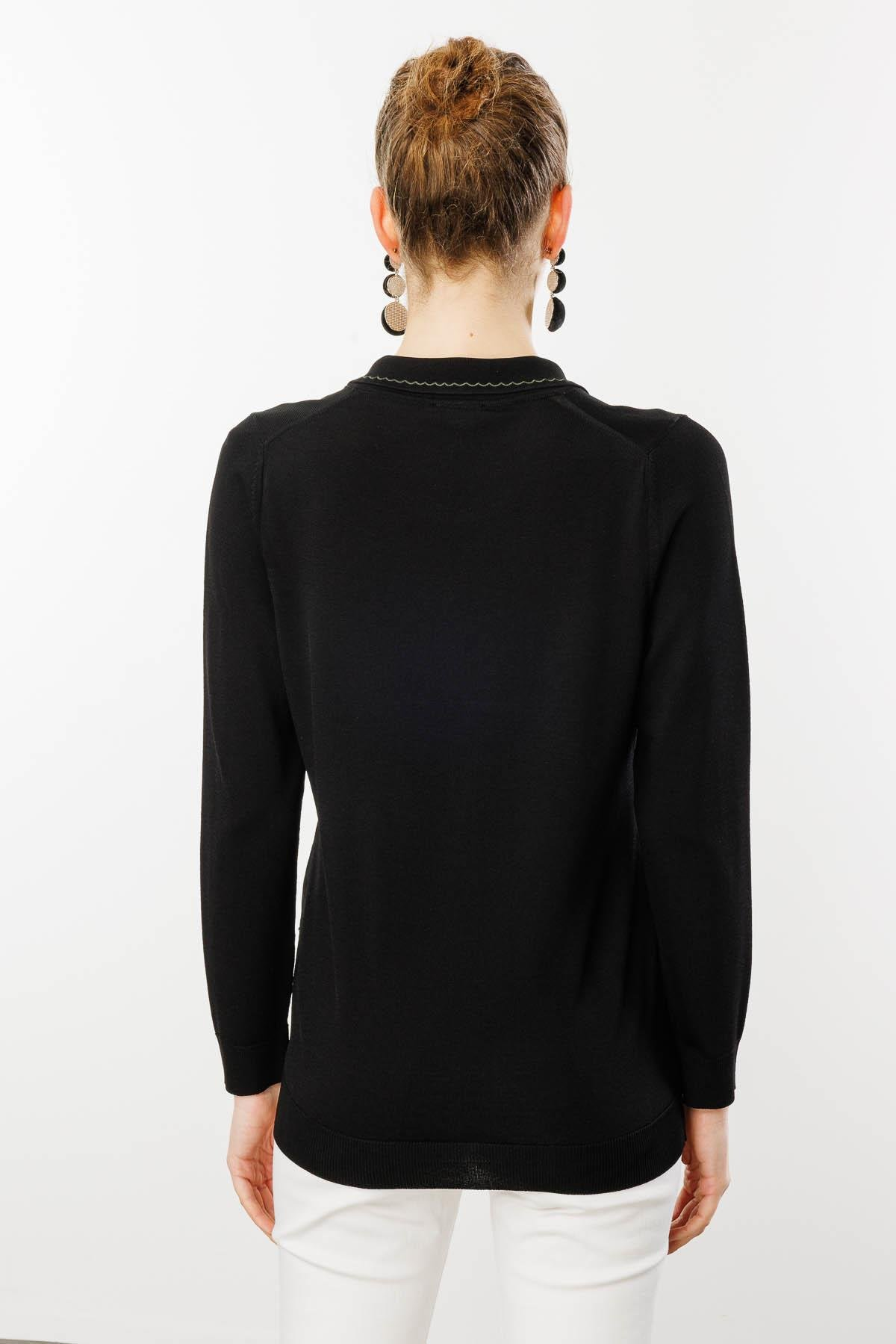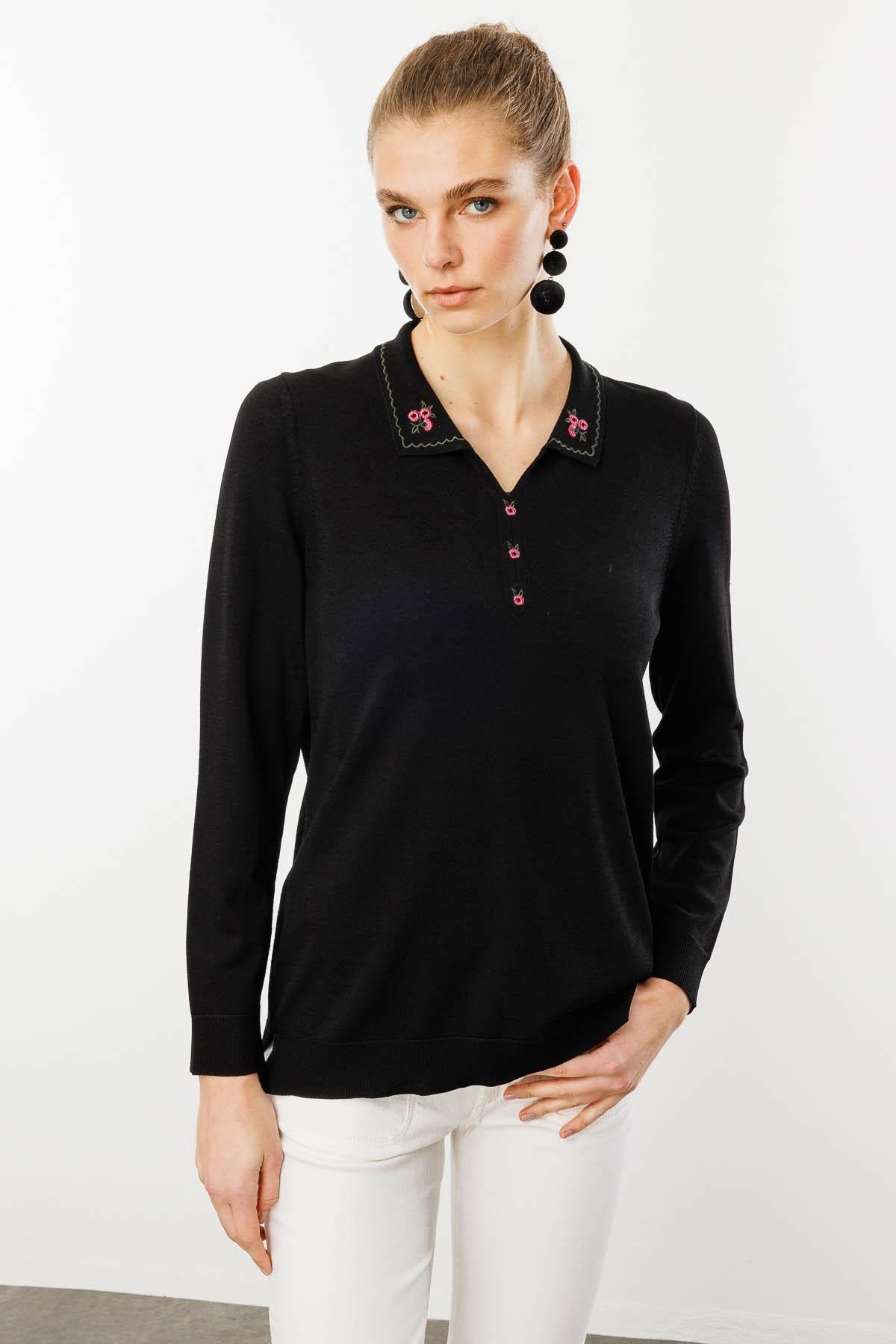 Kadın Polo Yaka Yakası Nakışlı Yazlık Triko Bluz Desen
