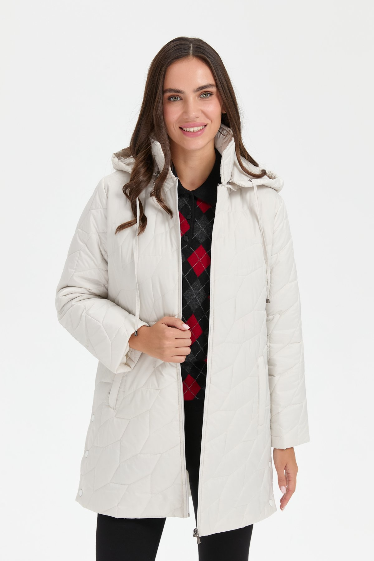 Kadın Polo Yaka Yanları Çıtçıtlı Yaprak Desenli Araboy Kapitone Kaban Desen