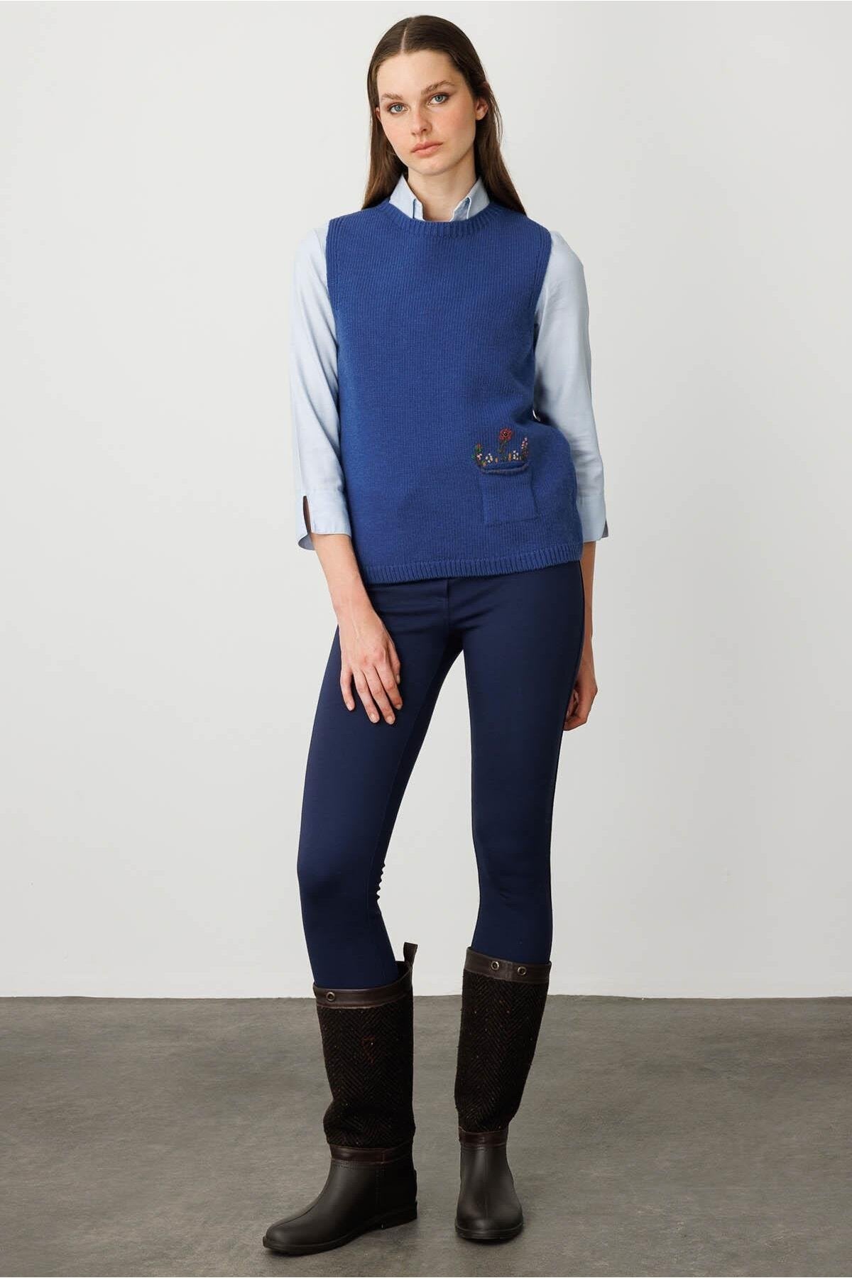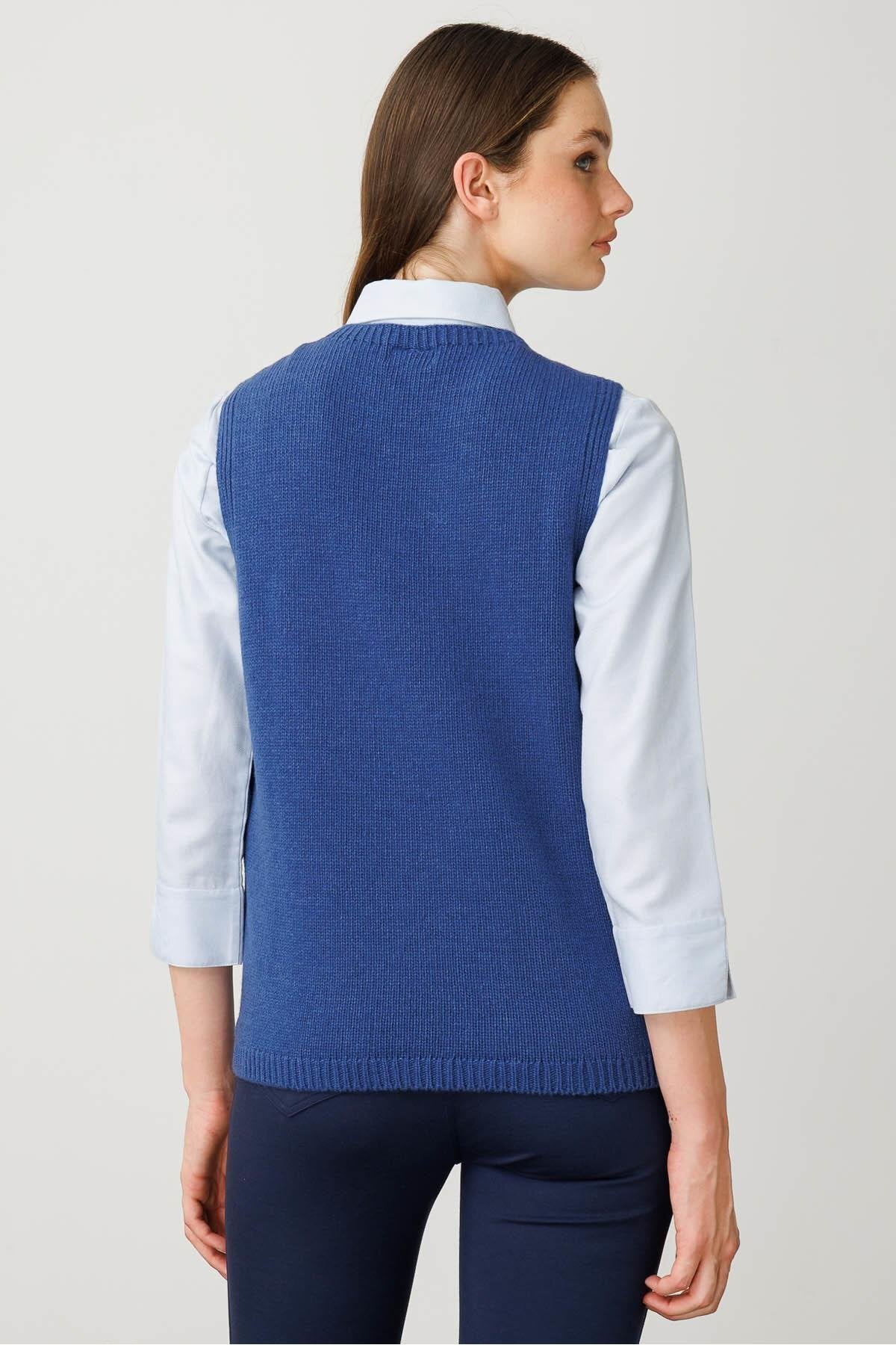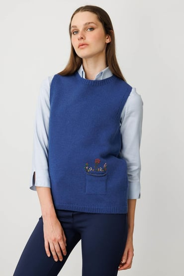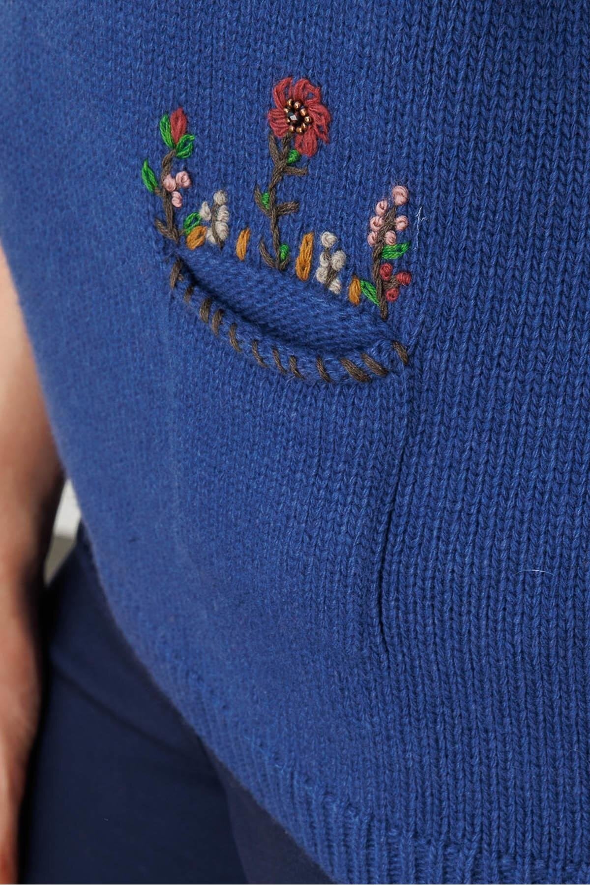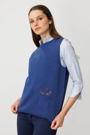 Kadın Sıfır Yaka Cep Üstü Çiçek Nakışlı Yün Süveter Desen