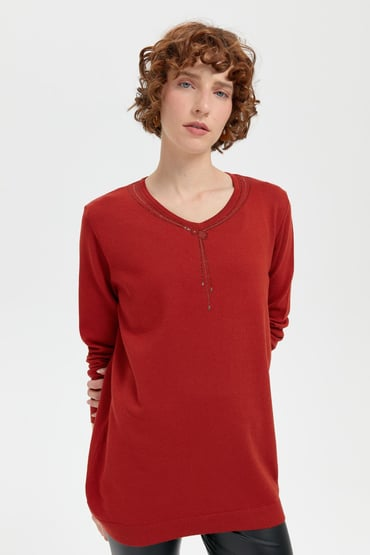 Kadın V Yaka Taşlı Kolye Desenli Ligra Bluz Desen