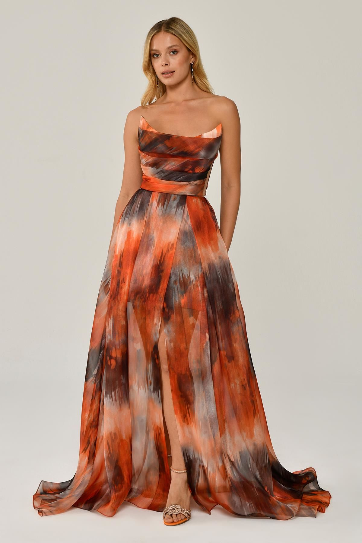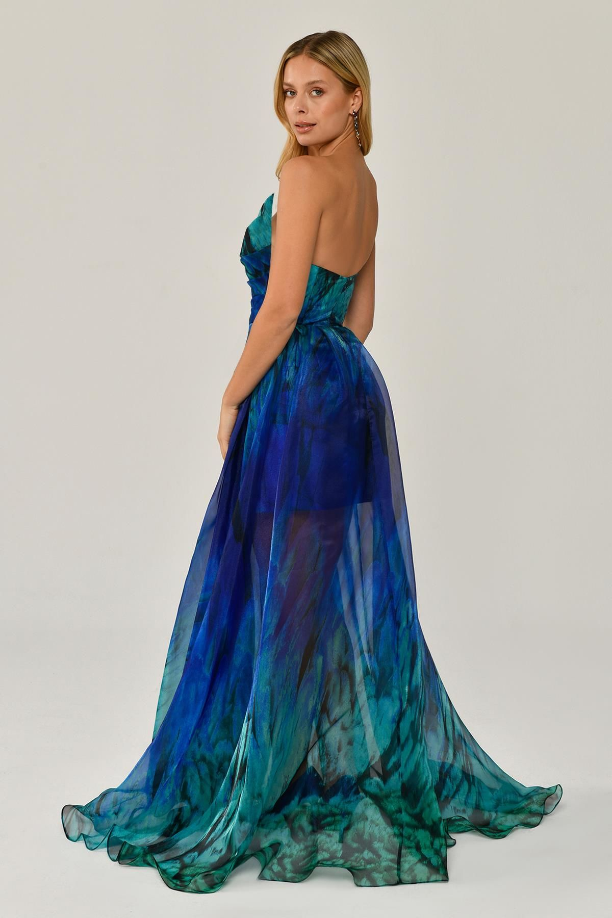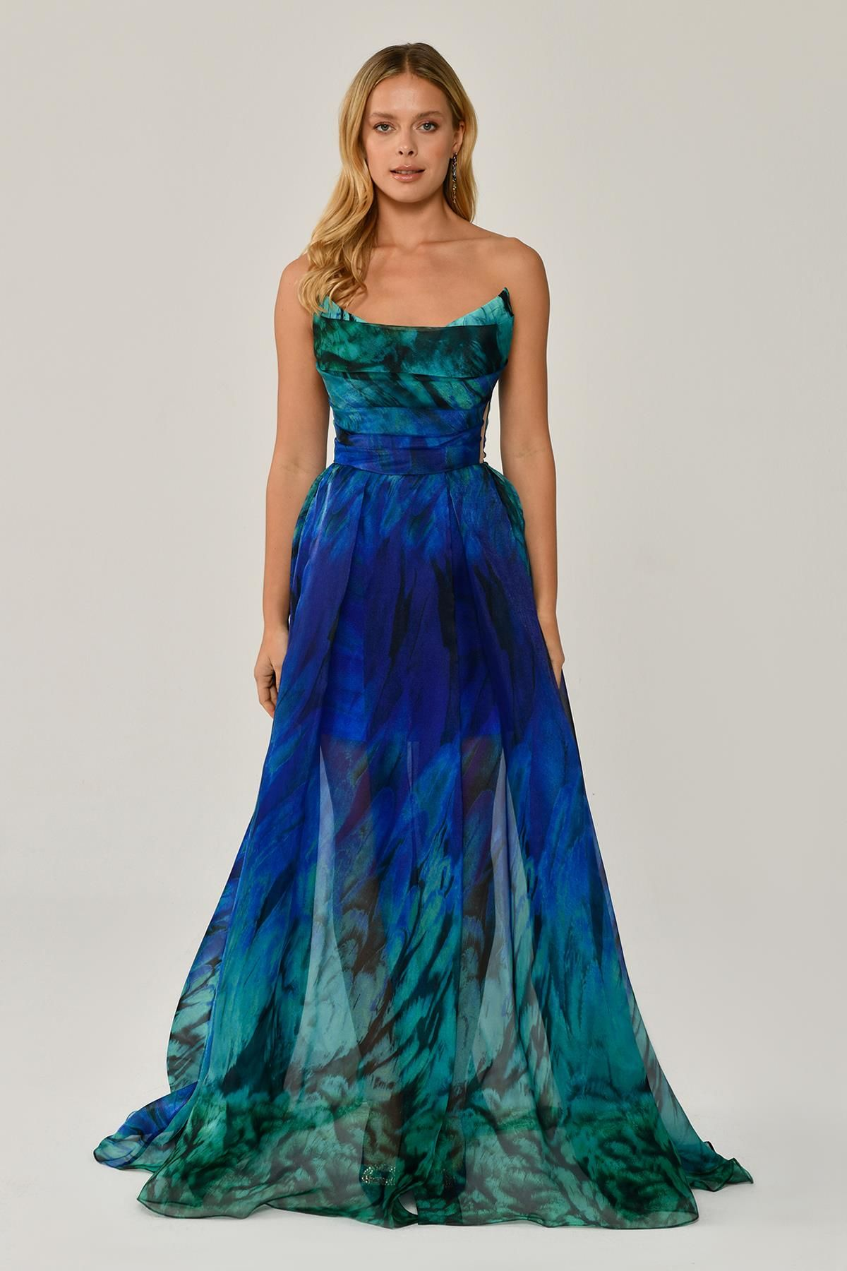 Kayık Yaka Desenli Tül Uzun Abiye Elbise Alfa Beta