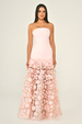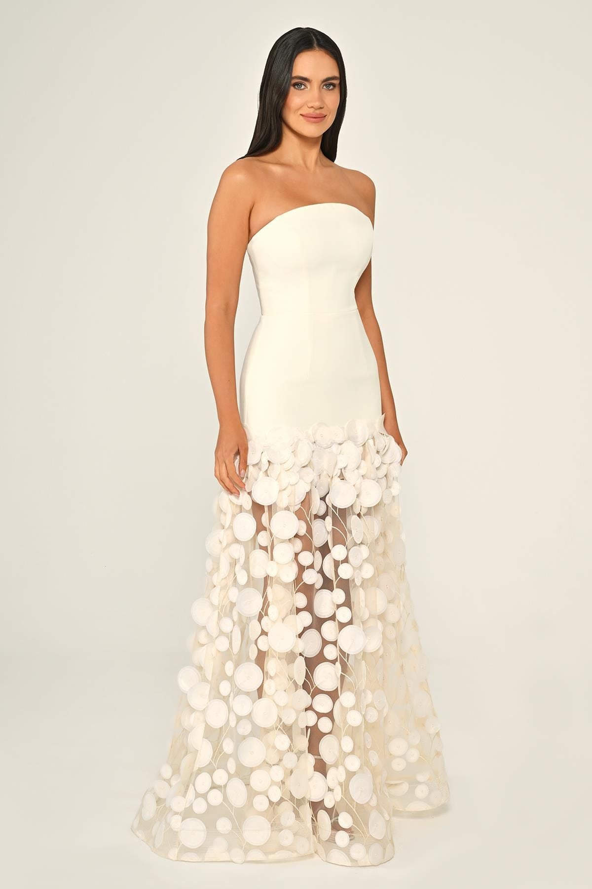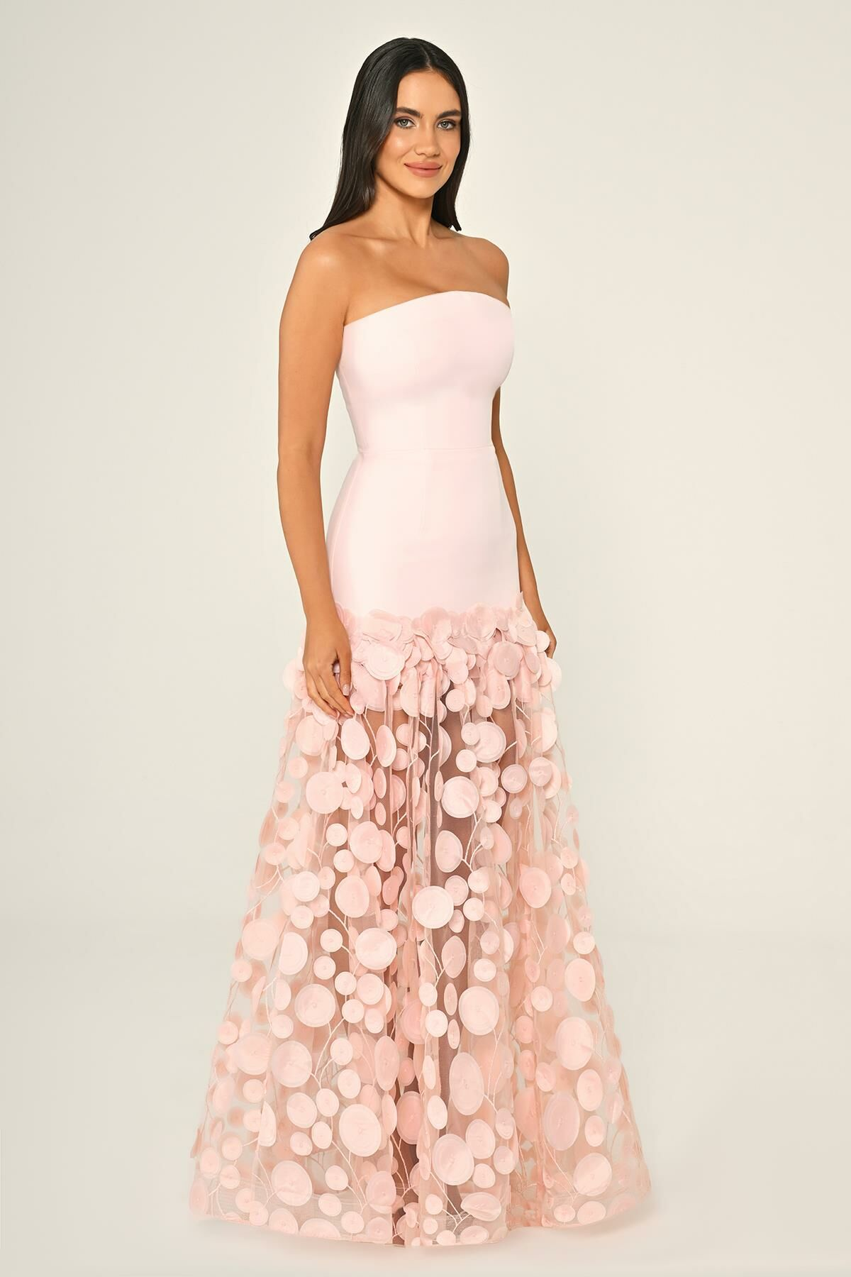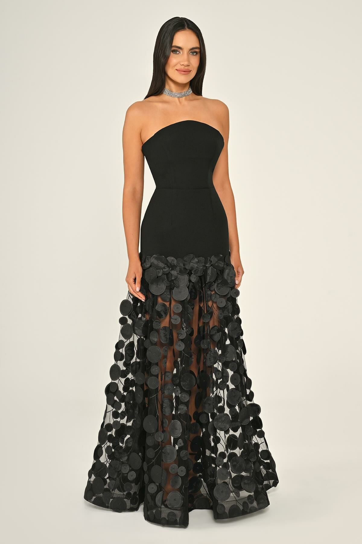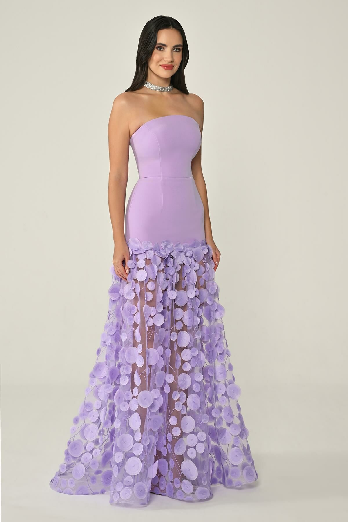 Straplez Üst Krep Eteği 3 Boyutlu Tül Uzun Elbise