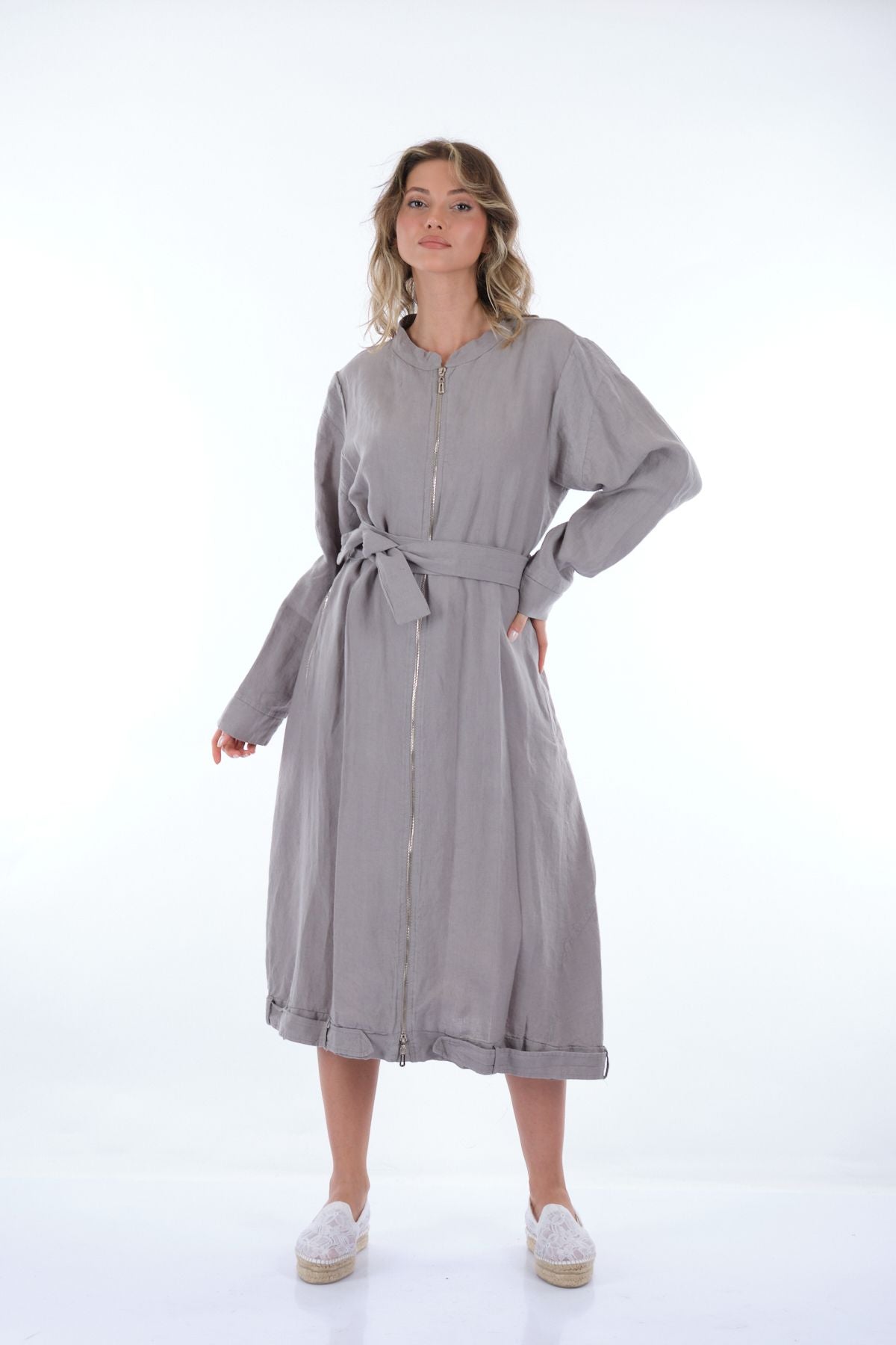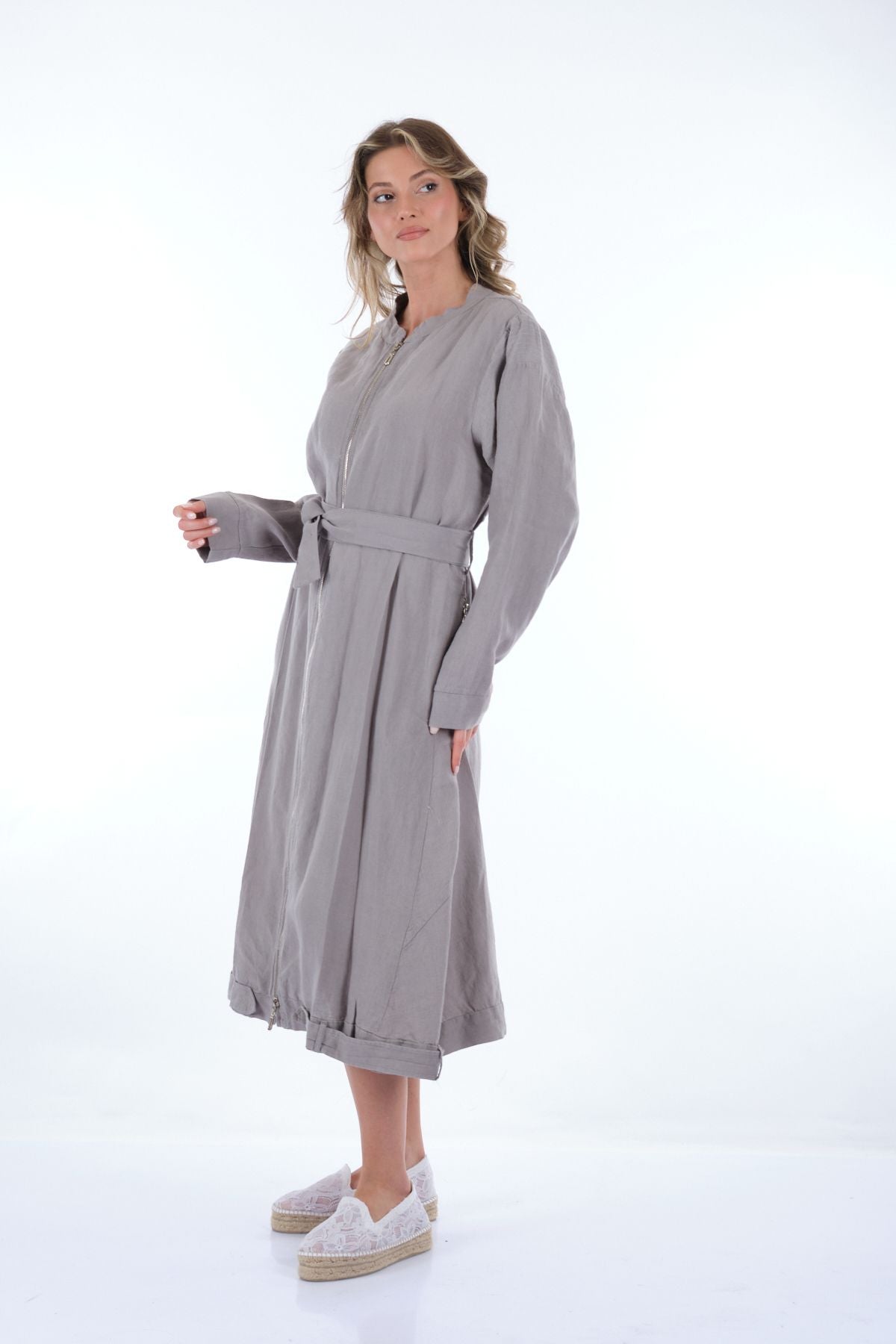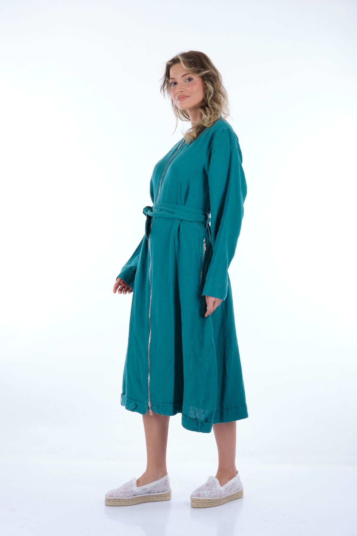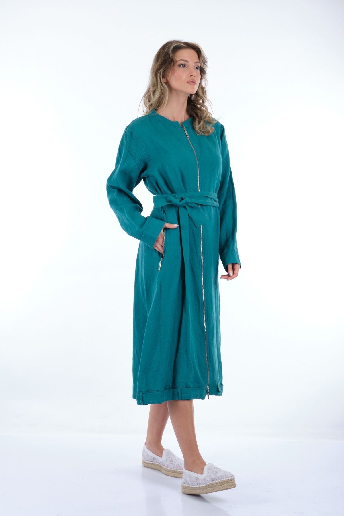 Manken Ölçüsü : Kilo : 52 kg / Boy : 1.73 cm / Göğüs : 86 cm / Bel : 65 cm / Basen : 92 cm / Beden : 38; Kumaş İçeriği:% 100 KETEN